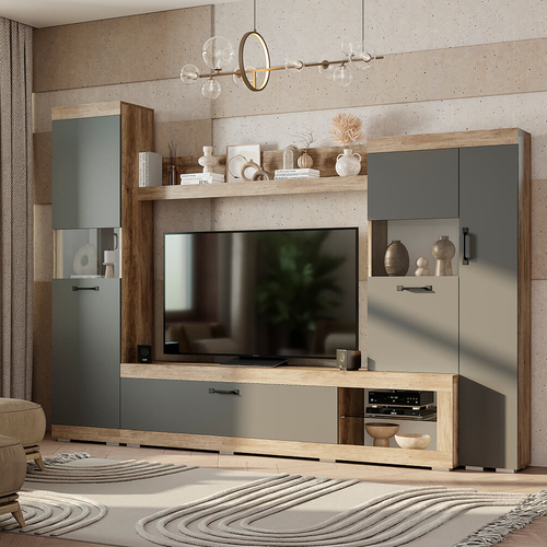 Цвет гостиной выполнен в сочетании дуб каньон и графит, что придает ей современный и элегантный вид. Фурнитура выполнена в черном цвете, что добавляет изделию строгости и элегантности.