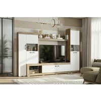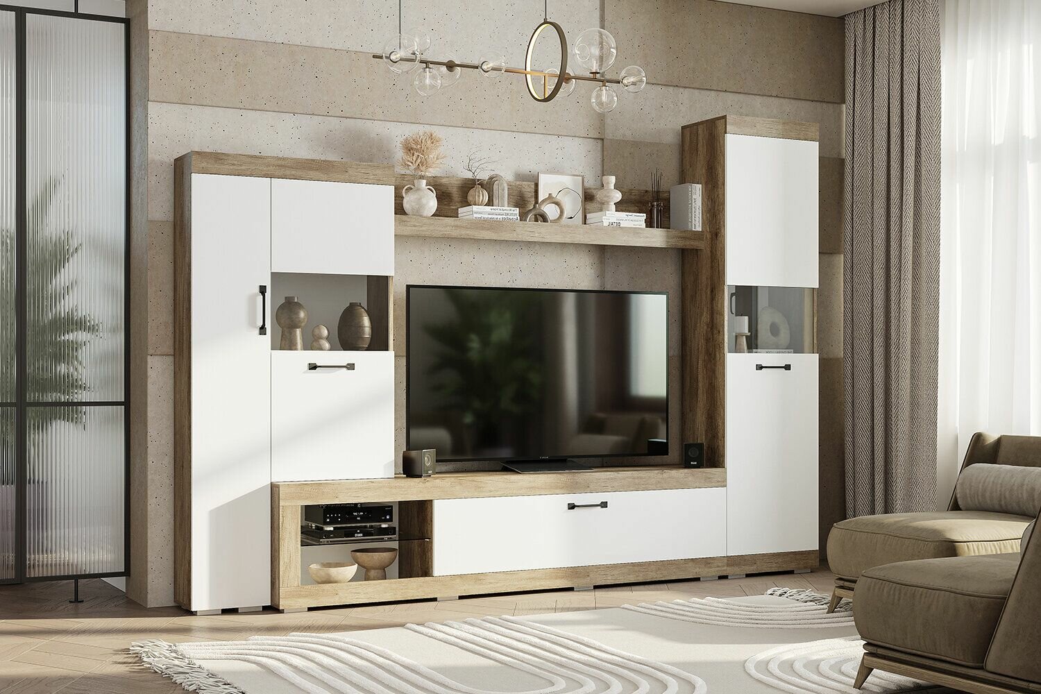 Материал корпуса и фасадов: ЛДСП. Вставки фасадов: стекло. Гостиная имеет несколько секций с полками за глухими фасадами и фасадами со стеклянными вставками; открытую полку для книг или декора; тумбу под телевизор, оснащенную отделением с откидным фасадом; открытую нишу со стеклополкой .