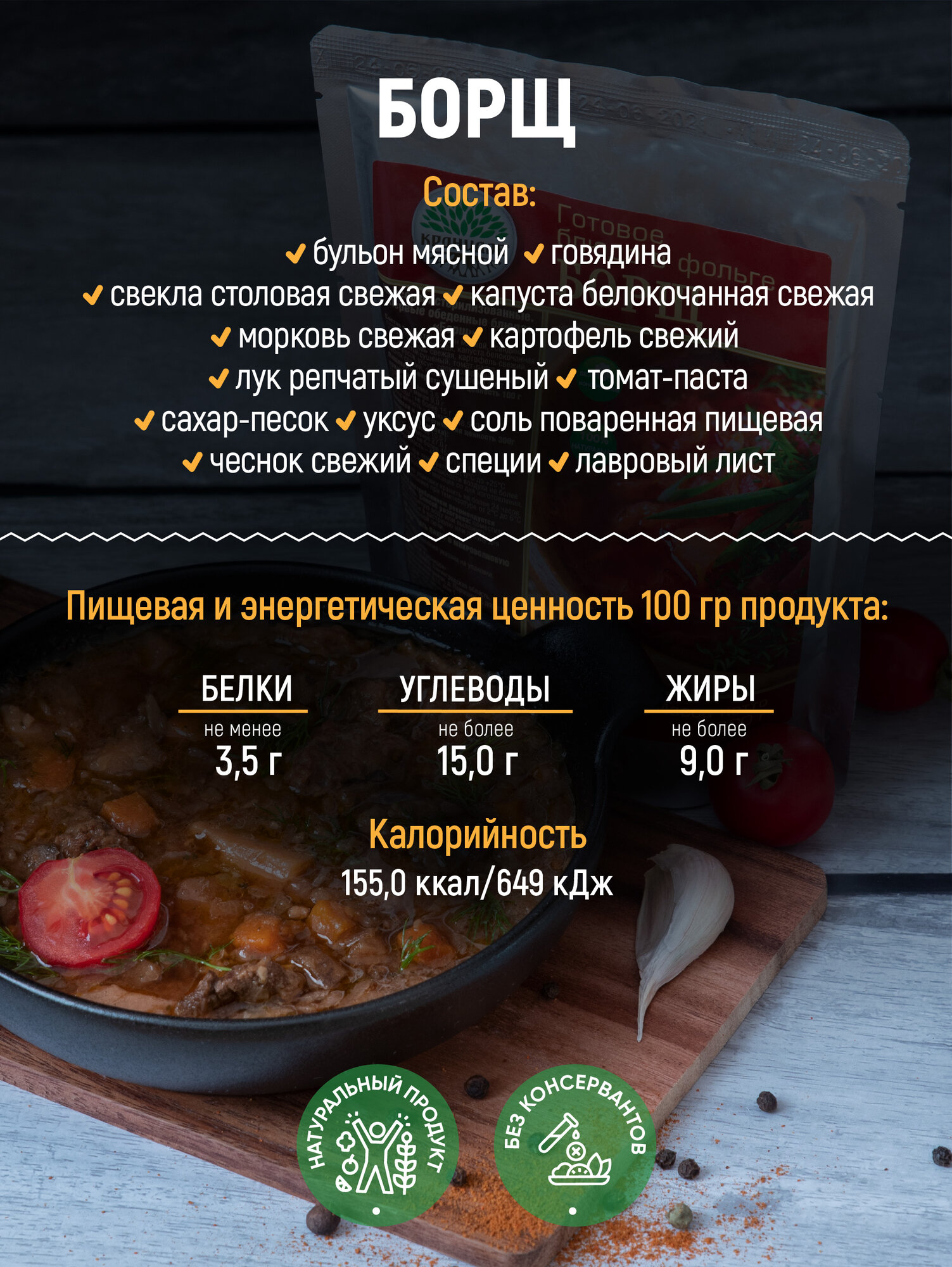 | Состав | говядина, картофель, лук репчатый, лавровый лист, чеснок свежий, соль поваренная пищевая, морковь свежая, свекла столовая, капуста белокочанная свежая, томат-паста |