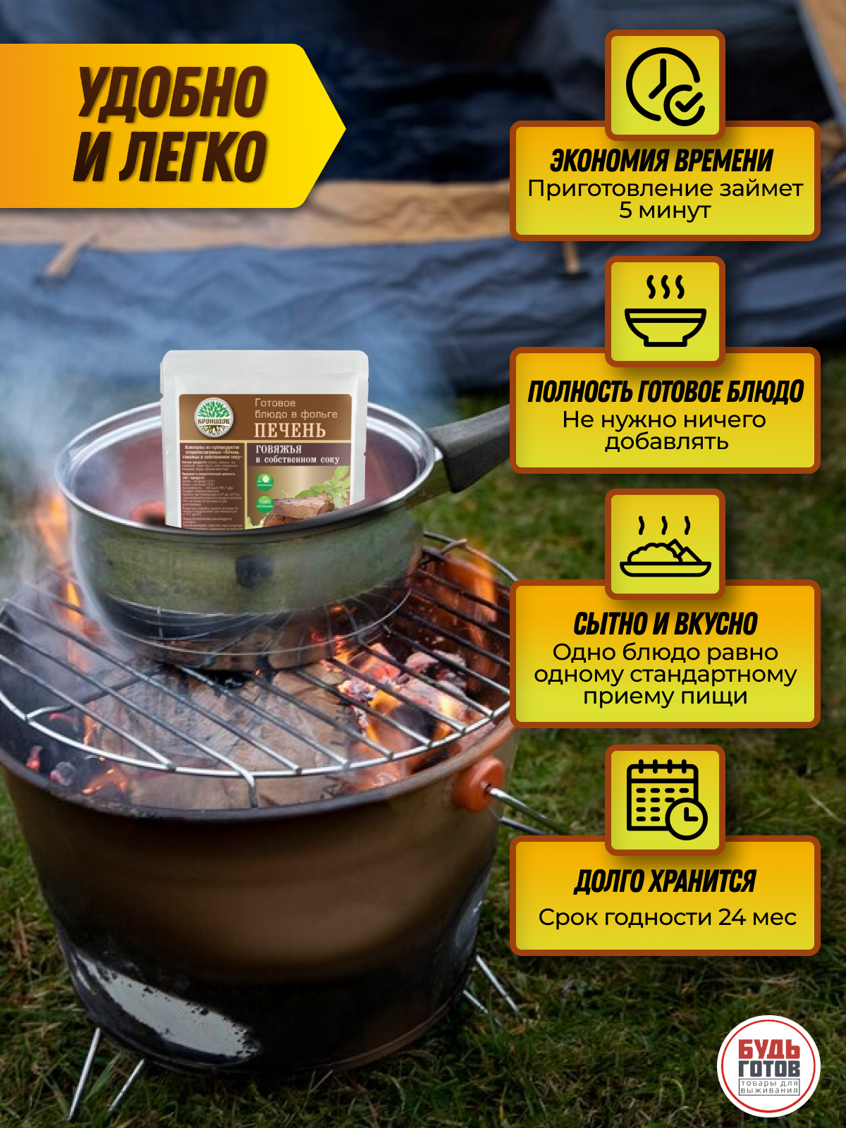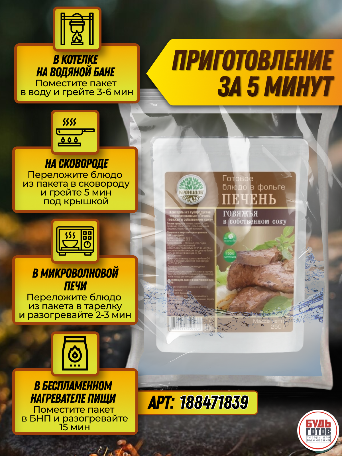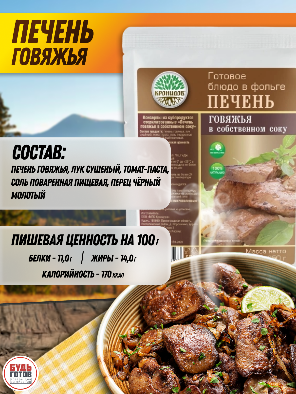 Готовое блюдо в реторт-пакете «Печень говяжья в собственном соку» Кронидов. Сухой паек для охоты, рыбалки, в поход. Набор 3 шт. по 250 гр.: сравнение цен, характеристики, фото, актуальное наличие и цены.