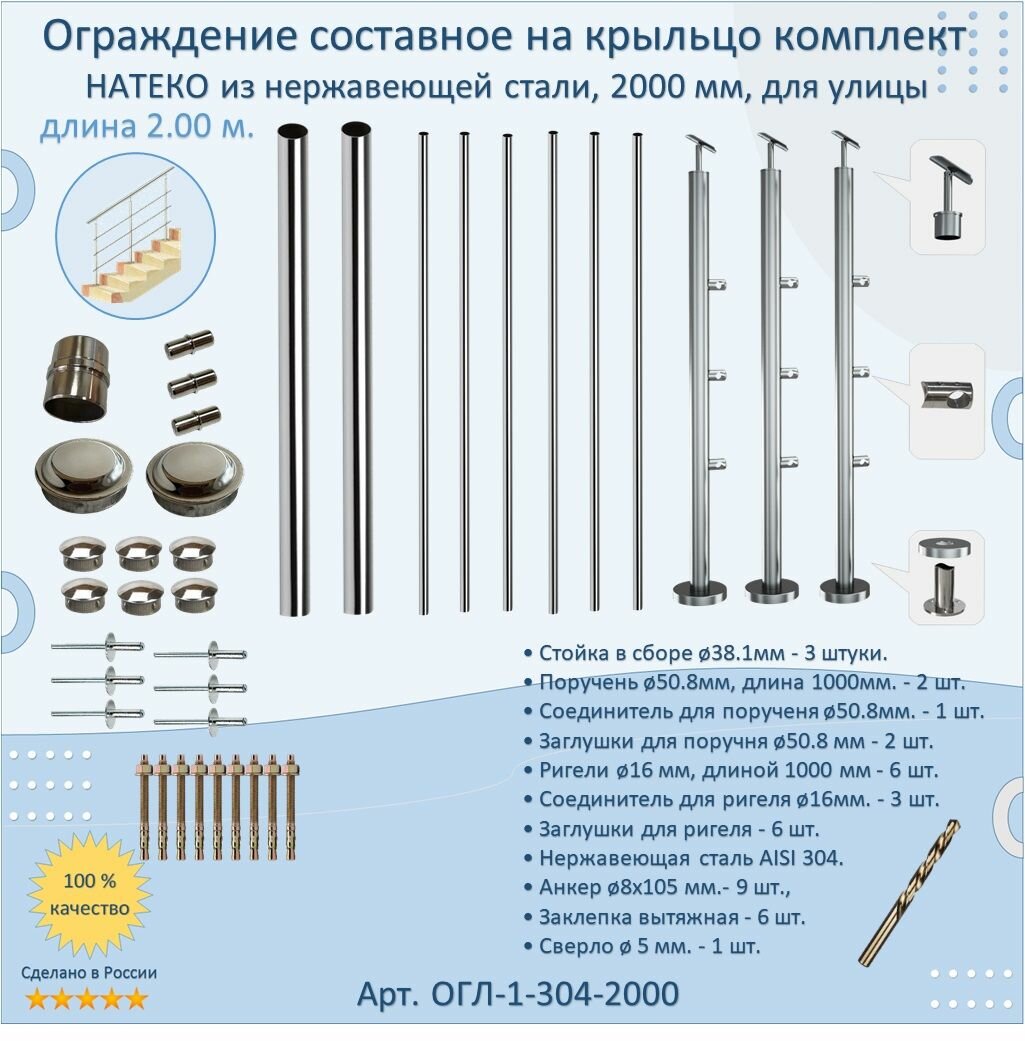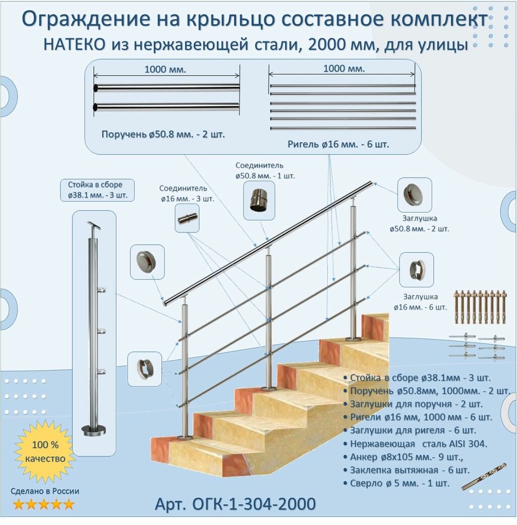 Перила для лестницы натеко, составное ограждение 2 м. из Нержавеющей Стали AISI 304, поручень 50.8 мм, из нержавейки для Улицы: сравнение цен, характеристики, фото, актуальное наличие и цены.