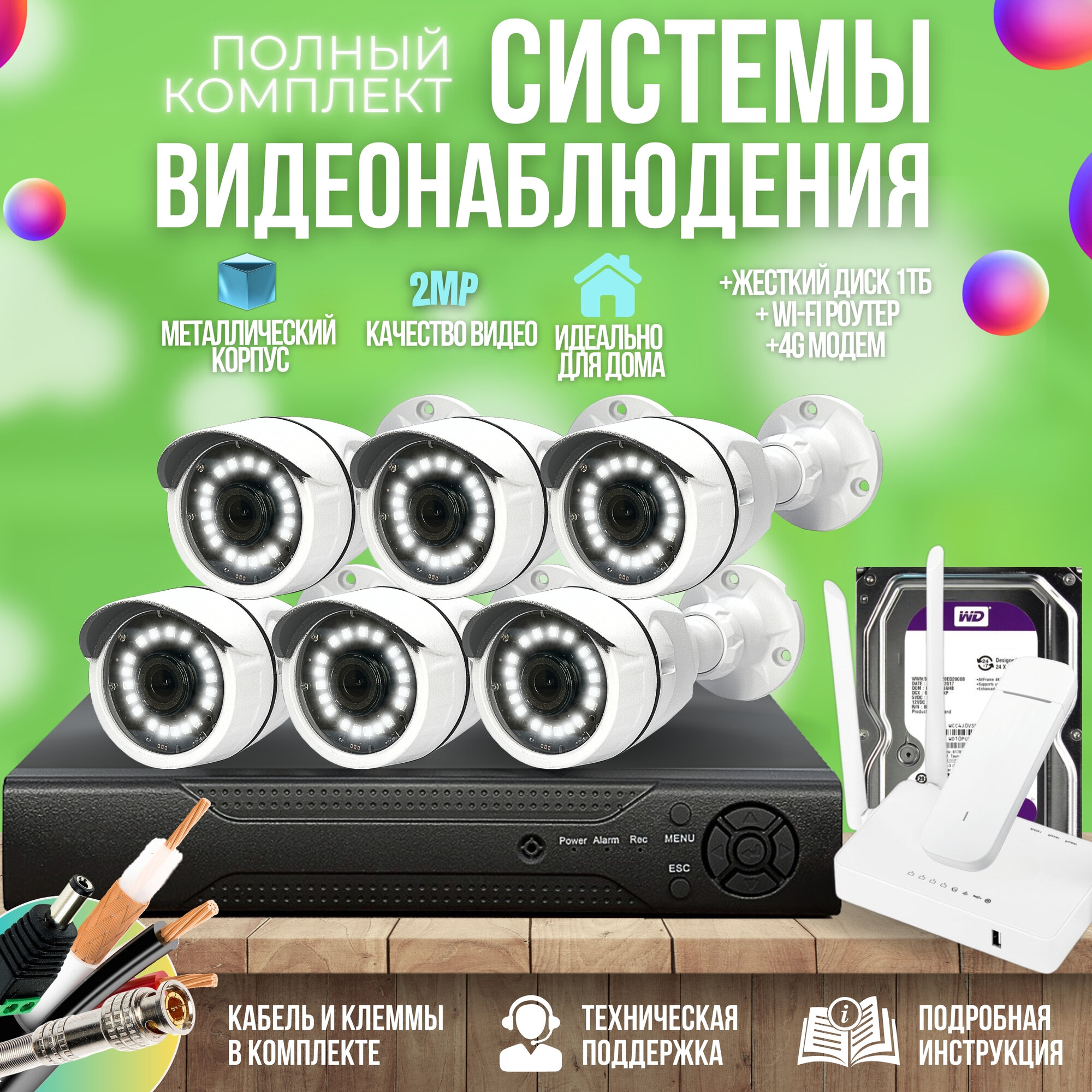Полноценный комплект видеонаблюдения для установки в месте где нет проводного интернета. Подходит для установки на даче или в загородном доме. В комплекте есть абсолютно всё, докупать ничего не нужно: видеорегистратор с жестким диском на 1 Тб, 6 камер видеонаблюдения, блок питания, кабель, роутер и модем для вывода изображения Вам на телефон. Вам останется только вставить SIM карту любого провайдера в модем, остальное всё есть в комплекте! Вы сможете наблюдать за происходящим в режиме онлайн с телефонов Android или Iphone, без задержек и потери качества видеоизображения. Преимущества перед другими комплектами: Угол обзора 107 градусов. Мощный процессор в видеорегистраторе для быстрой работы в приложении. Аналитика видео при которой оповещение на телефон придёт только тогда, когда в кадре появится именно человек, а не другой движущийся объект. Простота подключения мобильных устройств к видео: необходимо просто отсканировать QR - code с помощью камеры мобильного телефона. Съемка в ночное время с помощью ИК подсветки до 20м. Камеры в комплекте имеют целый ряд улучшителей изображения: BLC, DWDR, AWB, MWB,2DNR, AGC, ИК-фильтр.