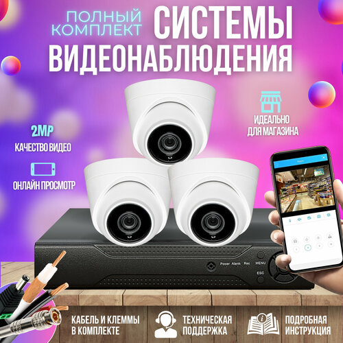 Полноценный комплект видеонаблюдения состоящий из AHD видеорегистратора, 3-х камер видеонаблюдения, блока питания и кабеля 30 м.