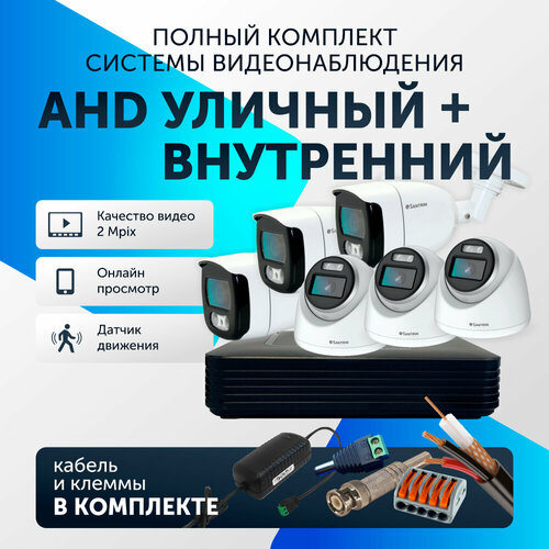 В комплект входят 6 купольных и уличных камер FullHD 2Mpix, видеорегистратор, блок питания и кабель.