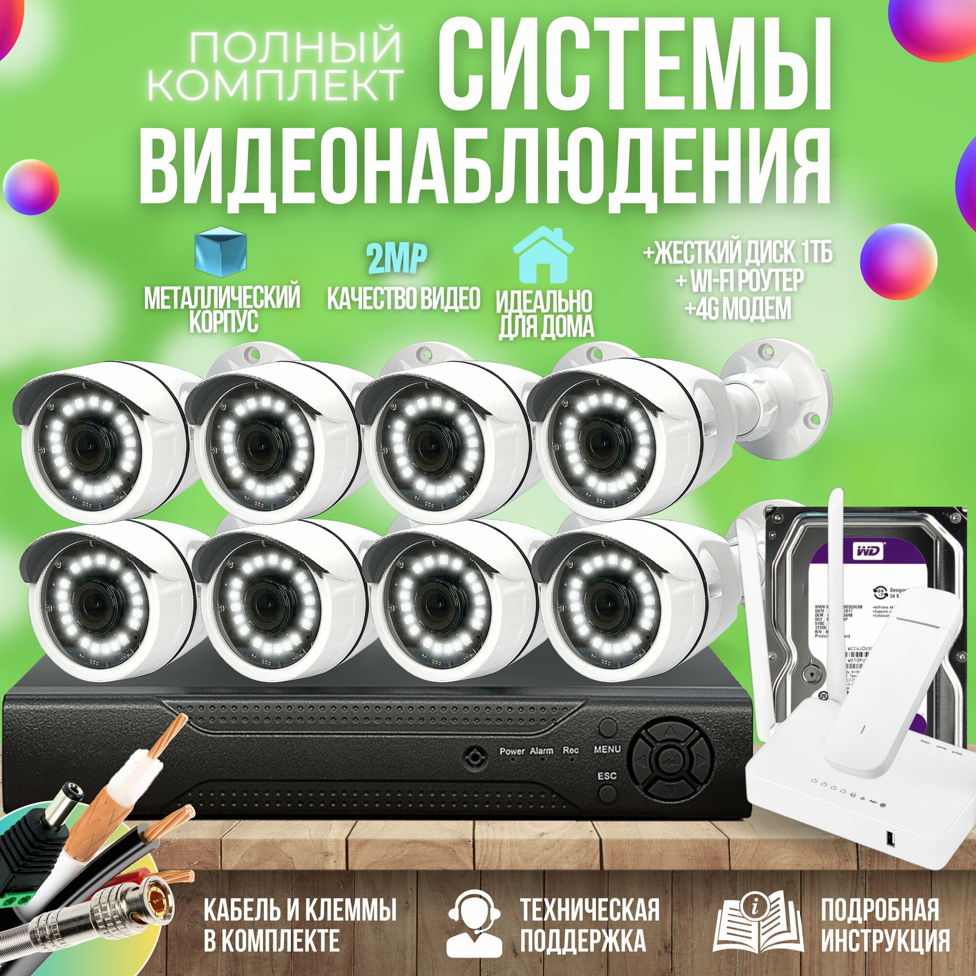 Полноценный комплект видеонаблюдения для установки в месте где нет проводного интернета. Подходит для установки на даче или в загородном доме. В комплекте есть абсолютно всё, докупать ничего не нужно: видеорегистратор с установленным в него жестким диском на 1 Тб, 8 камер видеонаблюдения, блок питания, кабель, роутер и модем для вывода изображения Вам на телефон. Вам останется только вставить SIM карту любого провайдера в модем, остальное всё есть в комплекте! Вы сможете наблюдать за происходящим в режиме онлайн с телефонов Android или Iphone, без задержек и потери качества видеоизображения. Преимущества перед другими комплектами: Угол обзора 82 градусов. Мощный процессор в видеорегистраторе для быстрой работы в приложении. Аналитика видео при которой оповещение на телефон придёт только тогда, когда в кадре появится именно человек, а не другой движущийся объект. Простота подключения мобильных устройств к видео: необходимо просто отсканировать QR - code с помощью камеры мобильного телефона. Съемка в ночное время с помощью ИК подсветки до 20м. Камеры в комплекте имеют целый ряд улучшителей изображения: BLC, DWDR, AWB, MWB,2DNR, AGC, ИК-фильтр.
