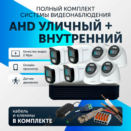 В комплект входят 8 купольных и уличных камер FullHD 2Mpix, видеорегистратор, блок питания и кабель.