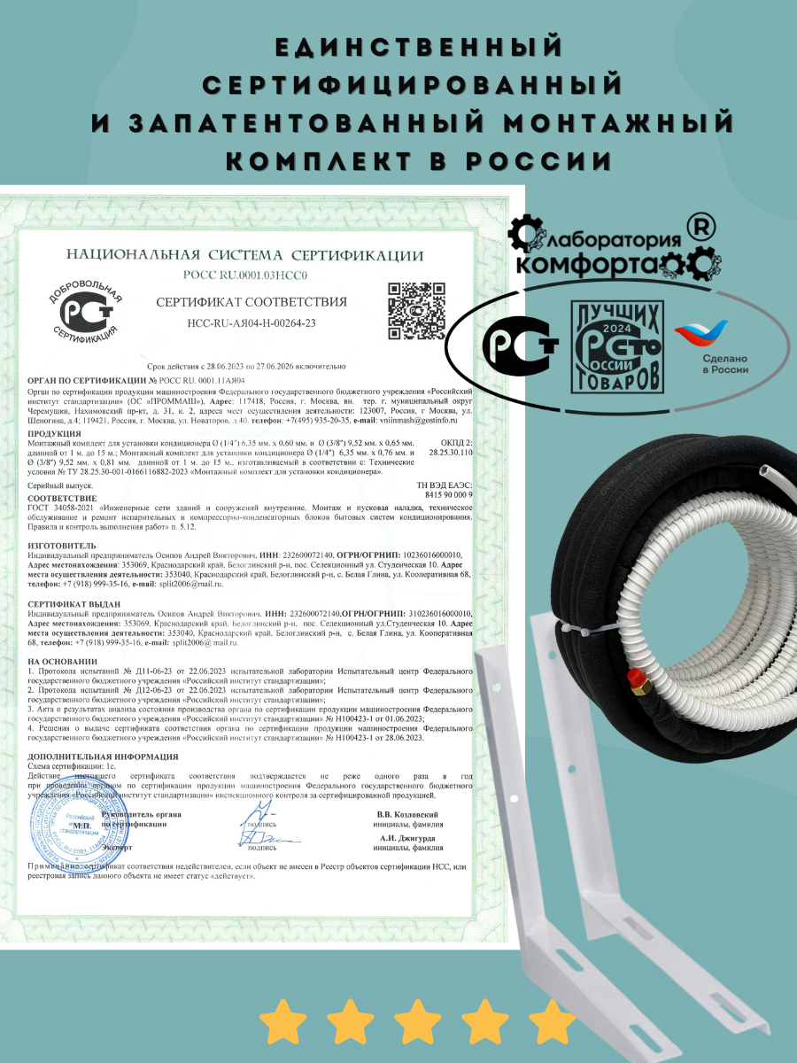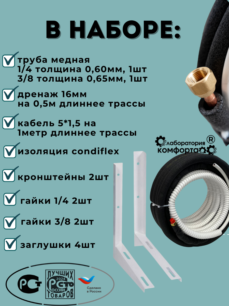 Комплект для установки кондиционера с кронштейнами и трассой от бренда "Комффорт" представляет собой идеальное решение для установки вашего кондиционера. Этот комплект включает в себя все необходимые элементы для быстрой и качественной установки, такие как изоляция, медная труба для дренажа, а также кронштейны и трасса для удобного расположения вашего кондиционера. Готовый набор для установки кондиционера на основе фирменной толстостенной меди BALLU Standard либо идентичный ICG, произведенной в соответствии с европейским стандартом EN 12735-1.
