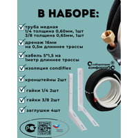 Гофрированная дренажная трубка 16мм BALLU для отвода конденсата от внутреннего блока. Дренажная труба идет на 0,5 метра длиннее трубы медной. Межблочный 5-ти жильный кабель 5\*1,5 ГОСТ на 1метр длиннее медной трубки для кондиционера. Изоляция BALLU condiflex powered by K-FLEX. Гайки 1/4 2шт, 3/8 2шт. Гайки уже надеты на медную трубу.