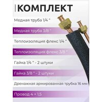 | Подробная комплектация | Труба медная в изоляции 1/4 - 4,5м Труба медная в изоляции 3/8 - 4,5м Труба дренажная 16мм - 4,5м Гайка 1/4 - 2шт Гайка 3/8 - 2шт Кабель 4х1,5-4,5м |