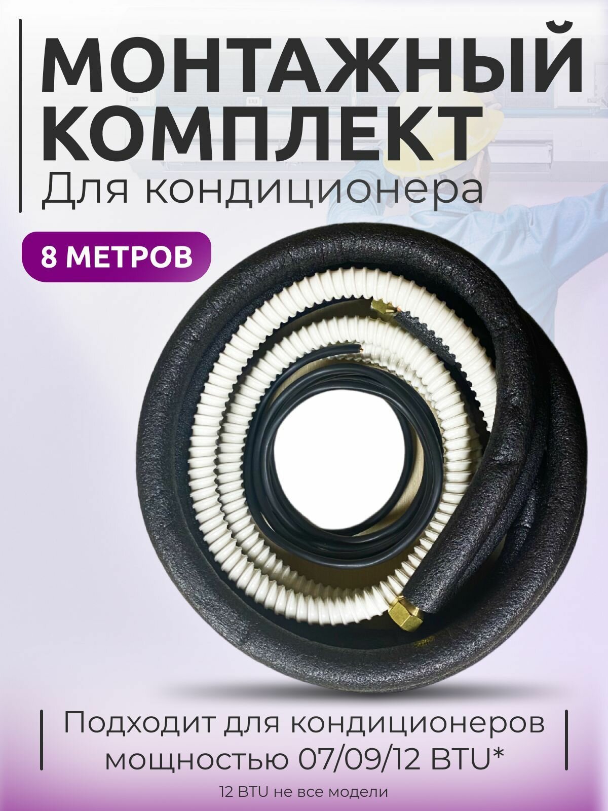 Готовая межблочная трасса для самостоятельного монтажа кондиционера/сплит-системы. Готовые трубки в теплоизоляции с развальцованными концами для герметичного соединения блоков кондиционера, Дренажный шланг для отвода конденсата от внутреннего блока, межблочный кабель. Подходит для кондиционеров с под соединительными размерами 1/4 и 3/8 (07,09 Модели; 7000BTU, 9000BTU, в некоторых случаях 12 Модели; 12000BTU). Труба медная в изоляции 1/4 - 8м. Труба медная в изоляции 3/8 - 8м. Труба дренажная 16мм - 8м. Гайка 1/4 - 2шт. Гайка 3/8 - 2шт. Кабель межблочный 4х1,5-8 м.