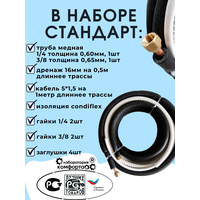 Дренажный шланг на 0,5м длиннее трассы для монтажа. — межблочный 5-ти жильный кабель 5\*1,5 ГОСТ на 1 метр длиннее самой трассы. — изоляция BALLU condiflex powered by K-FLEX. — гайки стандартные 1/4 2шт, 3/8 2шт. Гайки уже надеты на трубу. Наш готовый комплект "Стандарт" для монтажа кондиционера сделан на основе фирменной меди BALLU Olympic (либо идентичный ICG), произведенной в соответствии с европейским стандартом EN 12735-1.