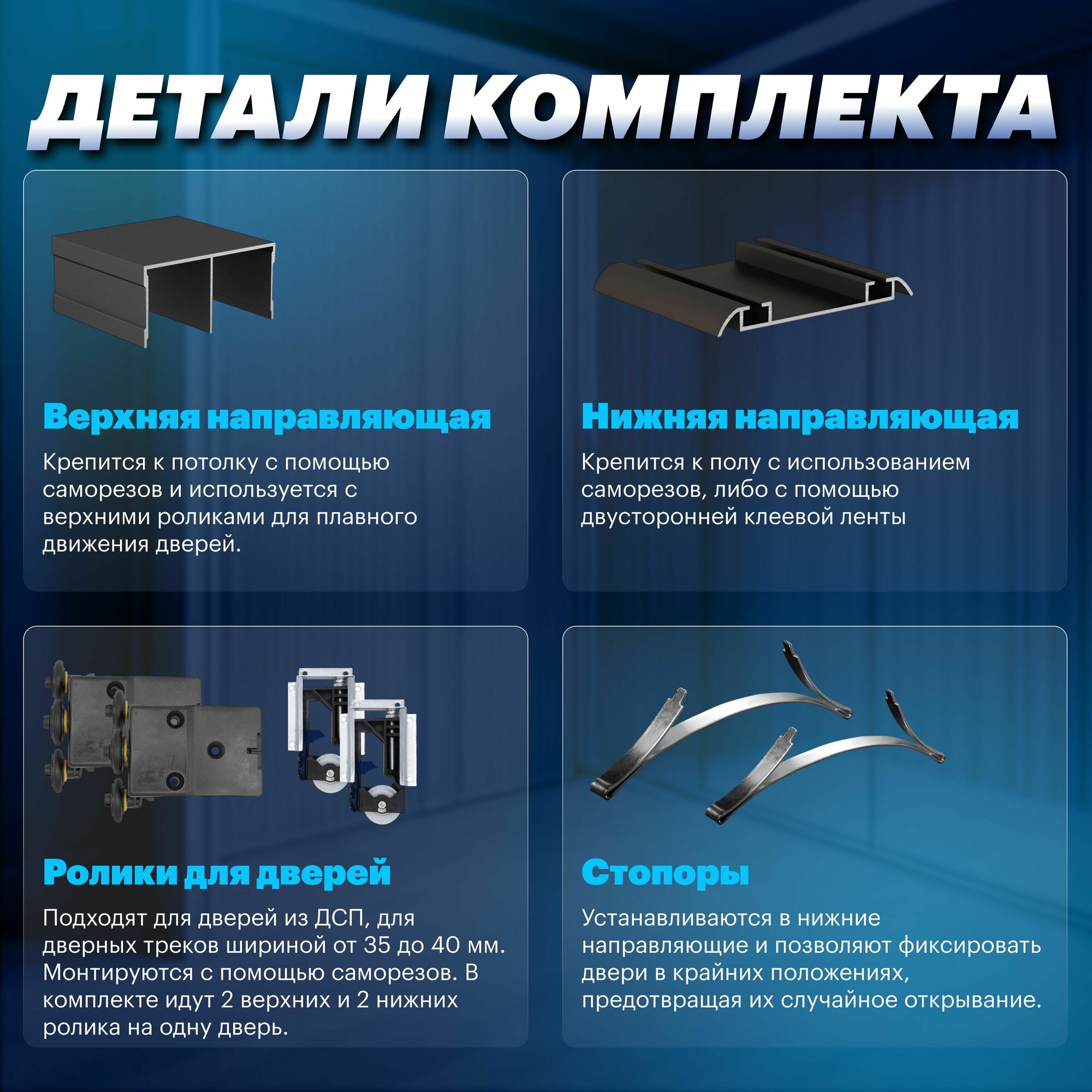 Готовый комплект фурнитуры для раздвижных дверей шкафа купе, с верхними, нижними направляющими, роликами на 2 двери и двумя стопорами, 1,9 метра, цвет черный: сравнение цен, характеристики, фото, актуальное наличие и цены.
