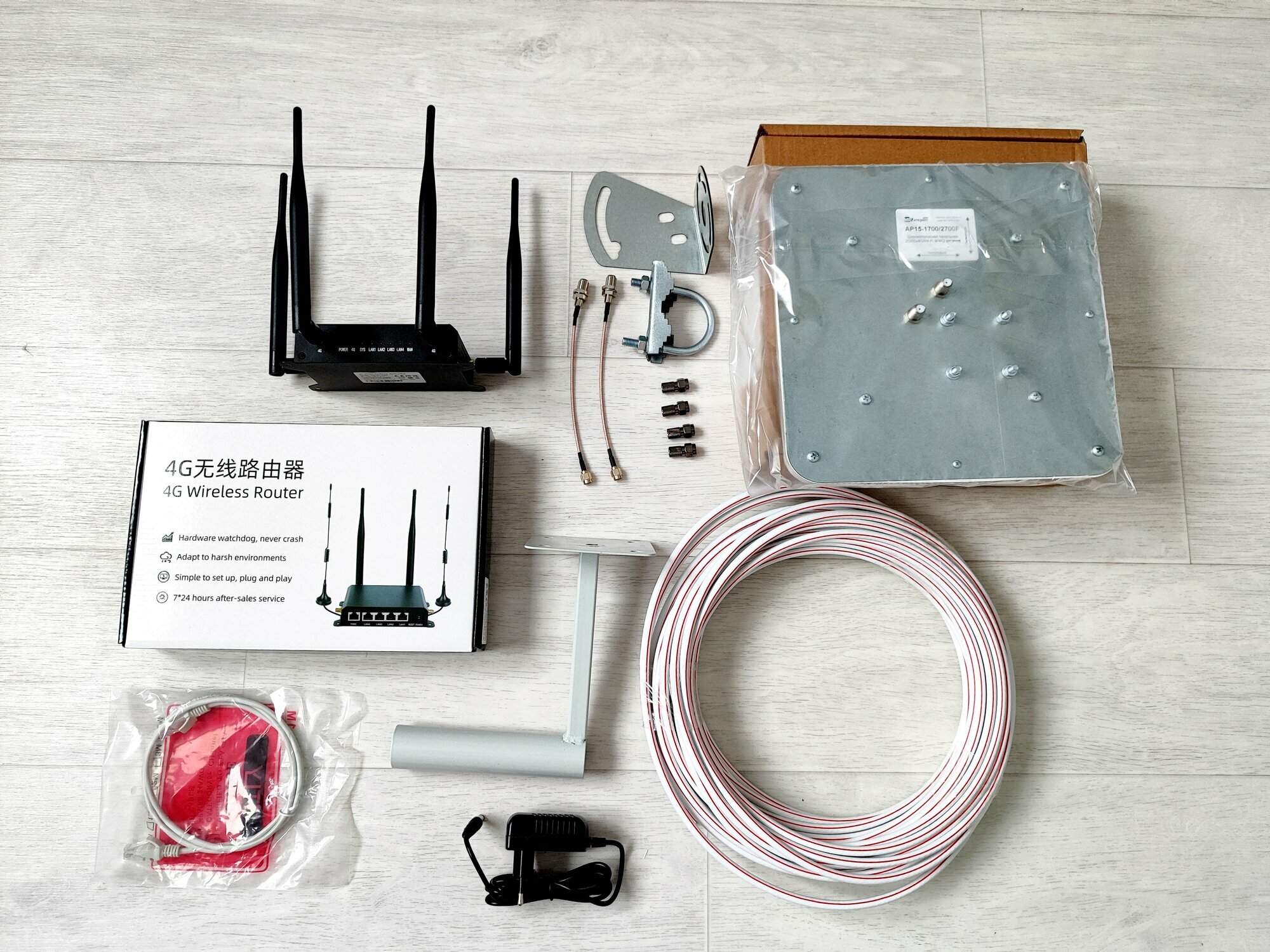 - Комплект качественных проводов (2шт по 10м), 2 разъема SMA-F, крепеж, стеновой кронштейн.