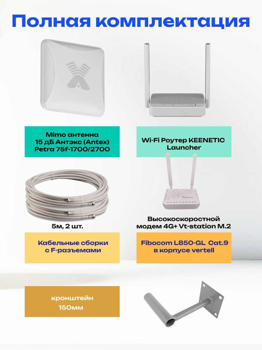 Состав комплекта: - Широкополосная панельная 2G/3G/4G антенна Антэкс Petra 75 Mimo F с усилением до 15 дБ - 1 шт. -Роутер 3G/4G Keenetic Launcher - 1 шт. - Модем 4G+ LTE Fibocom L850 cat.9 в корпусе Vertell VT-STATION-M.2 - 1 шт. - Антенный кабель - 2 штуки по 5 метров, - Фасадный кронштейн с выносом 15 см для крепления антенны - 1 шт, - Сим карта Теле2 - 1 шт. (при желании можем заменить на любого другого оператора, напишите нам) - Инструкция с контактами нашей техподдержки - 1 шт.