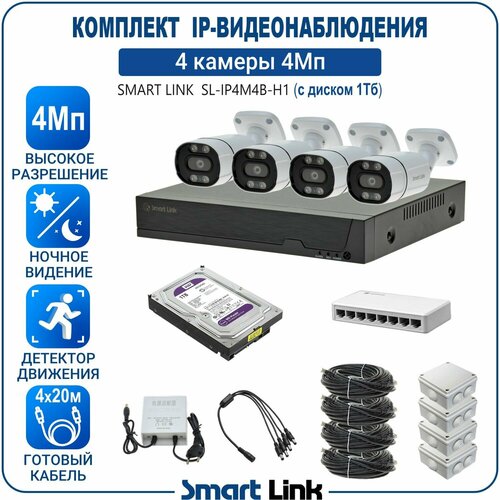 Готовый комплект IP-видеонаблюдения 4Мп, уличный, на 4 камеры, с жёстким диском на 1Tb, с удалённым просмотром, для дома / дачи / бизнеса. Smart Link SL-IP4M4B-H1: сравнение цен, характеристики, фото, актуальное наличие и цены.