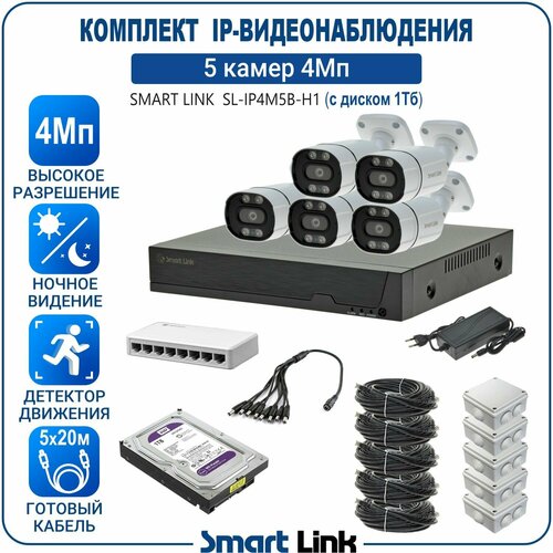 Готовый комплект IP-видеонаблюдения 4Мп, уличный, на 5 камер, с жёстким диском на 1Tb, с удалённым просмотром, для дома / дачи / бизнеса. Smart Link SL-IP4M5B-H1: сравнение цен, характеристики, фото, актуальное наличие и цены.