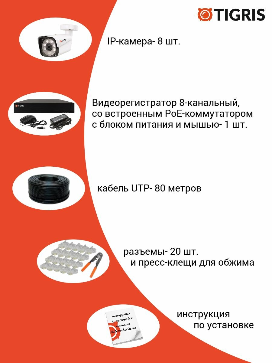 Данный комплект видеонаблюдения содержит все необходимое для установки и настройки полноценной профессиональной системы IP-видеонаблюдения из 8-ми цифровых PoE-видеокамер с разрешением 5 мегапикселей и встроенным микрофоном.