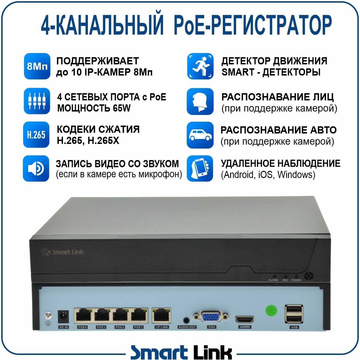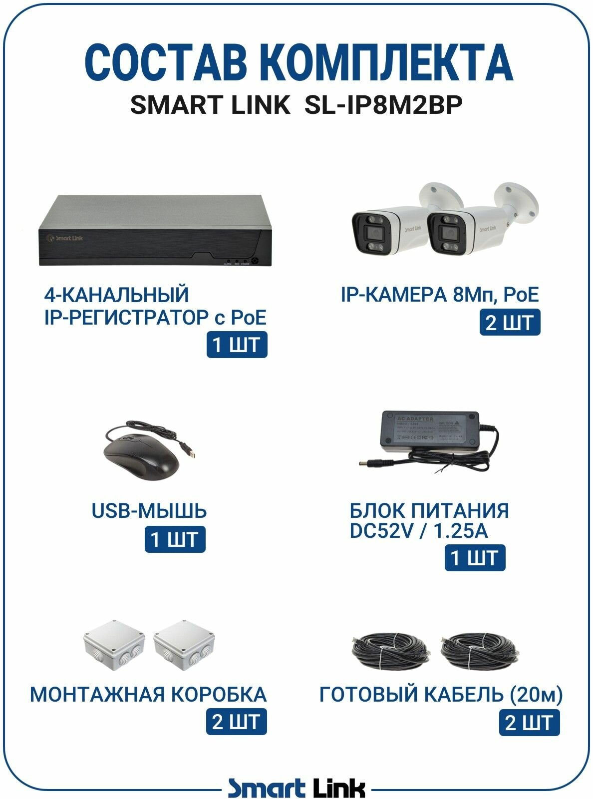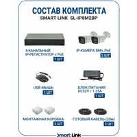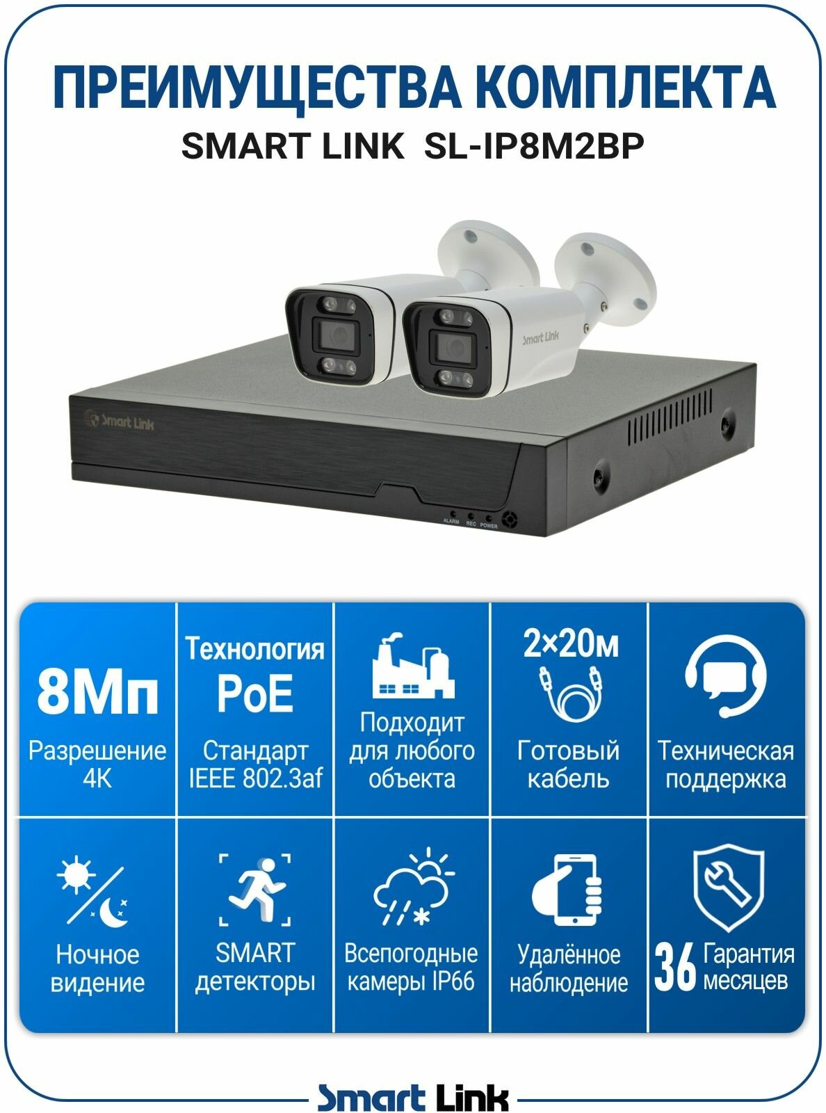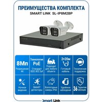 Готовый комплект PoE IP-видеонаблюдения 8Мп, уличный, на 2 камеры, с записью на жёсткий диск до 8Tb, с удалённым просмотром, для дома / дачи / бизнеса. Smart Link SL-IP8M2BP: сравнение цен, характеристики, фото, актуальное наличие и цены.