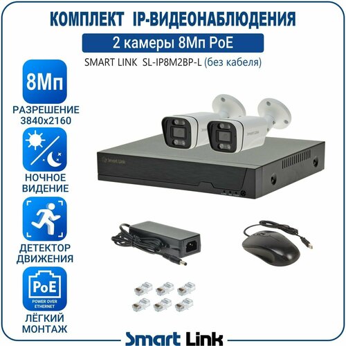 Комплект IP-видеонаблюдения 8Мп на 2 камеры Smart Link SL-IP8M2BP-L — это готовый набор, включающий в себя 2 уличные камеры, 4-канальный IP PoE-видеорегистратор, обеспечивающий запись камер на жёсткий диск (приобретается отдельно), блоки питания, коннекторы RJ-45 (кабель нужной длины приобретается отдельно), и другие необходимые комплектующие.