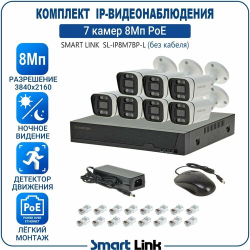 Комплект IP-видеонаблюдения 8Мп на 7 камер Smart Link SL-IP8M7BP-L — это готовый набор, включающий в себя 7 уличных камер, 8-канальный IP PoE-видеорегистратор, обеспечивающий запись камер на жёсткий диск (приобретается отдельно), блоки питания, коннекторы RJ-45 (кабель нужной длины приобретается отдельно), и другие необходимые комплектующие.