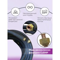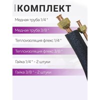Готовые трубки для самостоятельного монтажа кондиционера/сплит-системы. Готовые трубки в теплоизоляции с развальцованными концами для герметичного соединения блоков кондиционера. Подходит для кондиционеров с под соединительными размерами 1/4 и 3/8 (07,09 Модели; 7000BTU, 9000BTU, в некоторых случаях 12 Модели; 12000BTU). Труба медная в изоляции 1/4 - 15м. Труба медная в изоляции 3/8 - 15 м. Гайка 1/4 - 2шт. Гайка 3/8 - 2шт.
