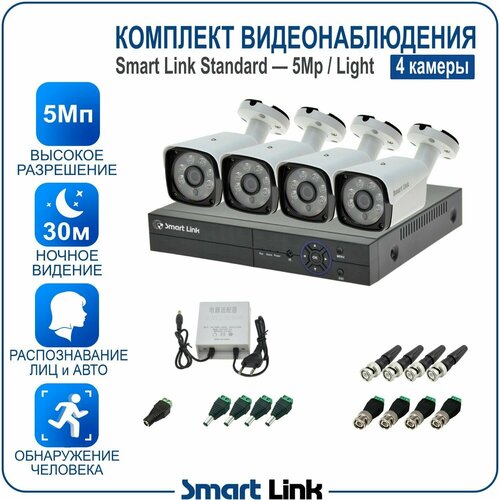 Комплект AHD видеонаблюдения 5Мп на 4 камеры Smart Link SL-5M5N4B-L — это готовый набор, включающий в себя 4 уличные камеры, 4-канальный видеорегистратор, обеспечивающий запись камер на жёсткий диск (диск приобретается отдельно), необходимые блоки питания, необходимые разъёмы для подключения камер (кабель приобретается отдельно), и все остальные комплектующие.
