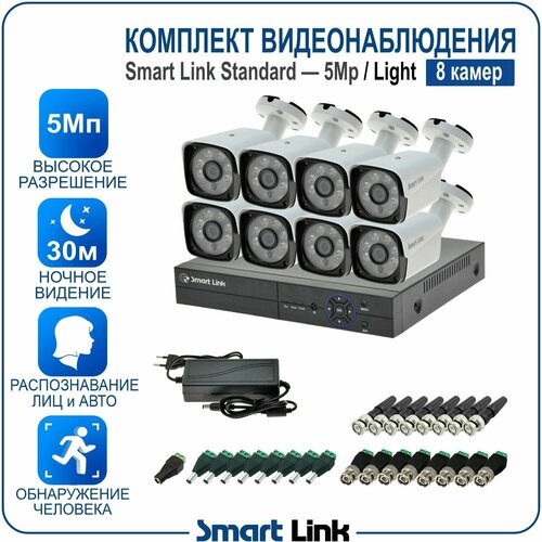 Комплект AHD видеонаблюдения 5Мп на 8 камер Smart Link SL-5M5N8B-L — это готовый набор, включающий в себя 8 уличных камер, 8-канальный видеорегистратор, обеспечивающий запись камер на жёсткий диск (диск приобретается отдельно), необходимые блоки питания, необходимые разъёмы для подключения камер (кабель приобретается отдельно), и все остальные комплектующие.