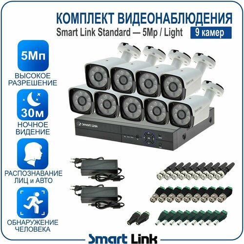 Комплект AHD видеонаблюдения 5Мп на 9 камер Smart Link SL-5M5N9B-L — это готовый набор, включающий в себя 9 уличных камер, 16-канальный видеорегистратор, обеспечивающий запись камер на жёсткий диск (диск приобретается отдельно), необходимые блоки питания, необходимые разъёмы для подключения камер (кабель приобретается отдельно), и все остальные комплектующие.