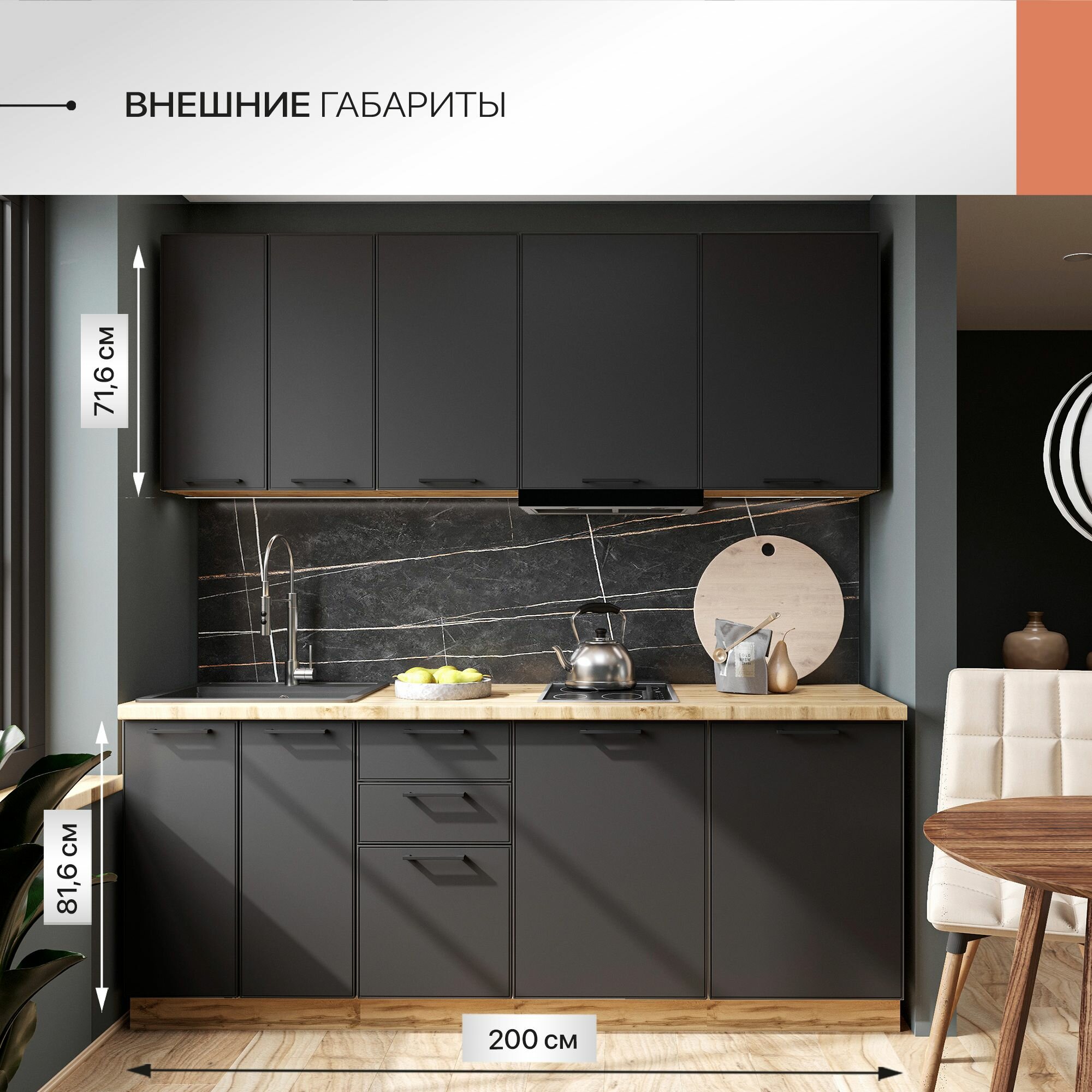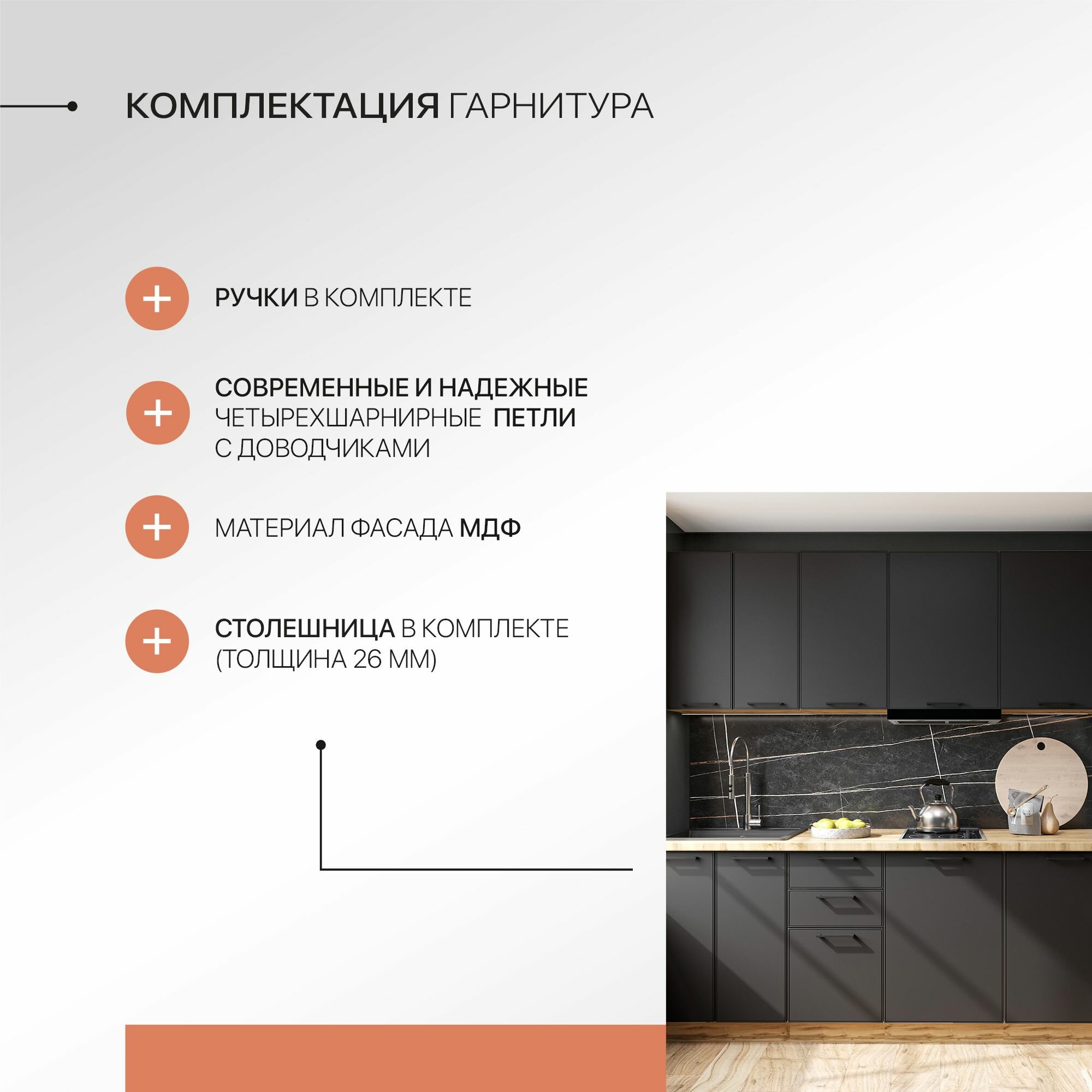 | Дополнительная информация | Столешница поставляется в размер кухни (длинномер) Мойка в комплект не входит Бытовая техника покупается отдельно |