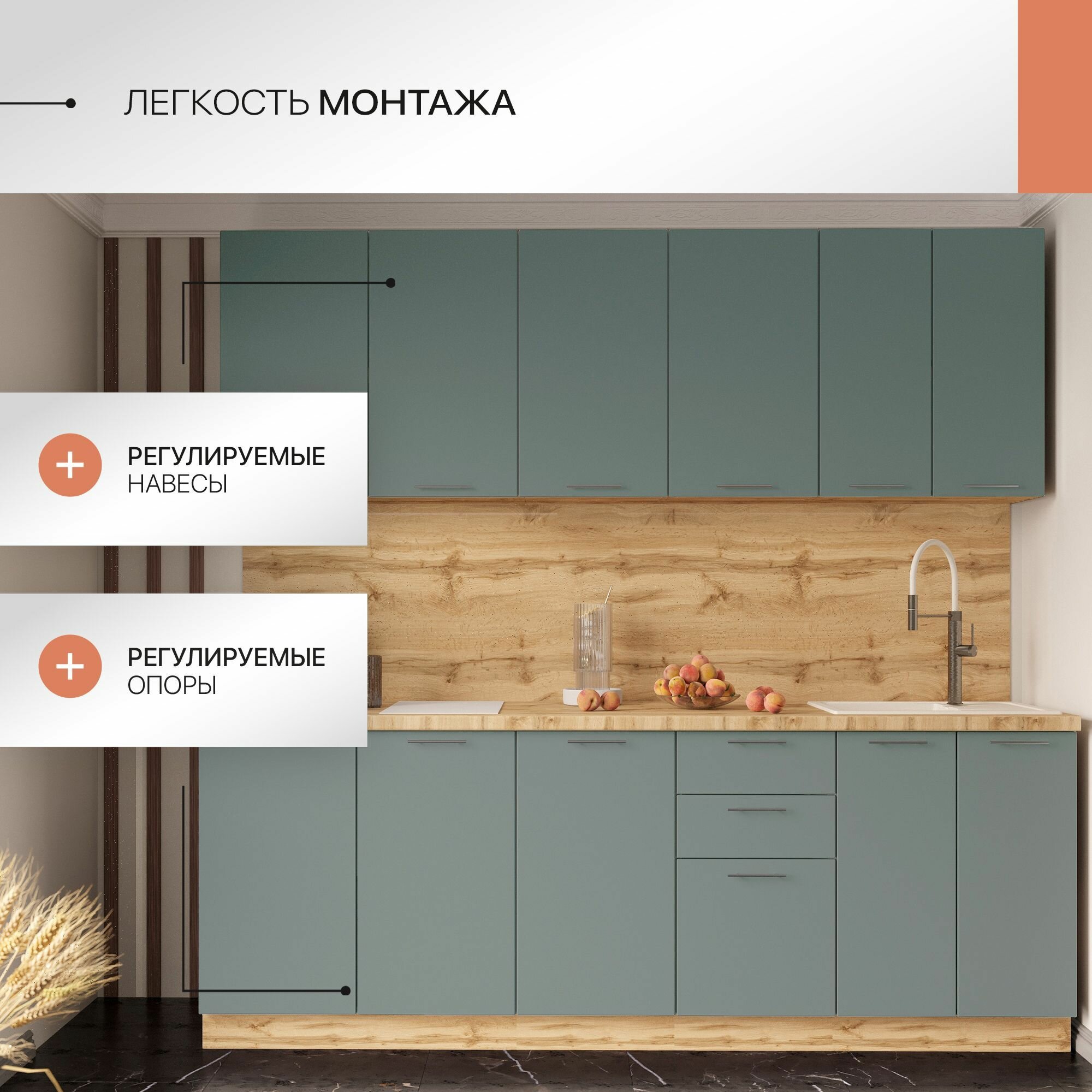 | Дополнительная информация | В состав комплекта входят модули: 2015895206831 "2", 2015895206848, 2015895206855, 2015895206886, 2015895206862, 2015895206893, 2015895206916, 2015895209870 Столешница поставляется в размер кухни (длинномер) Мойка в комплект не входит Бытовая техника покупается отдельно |