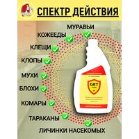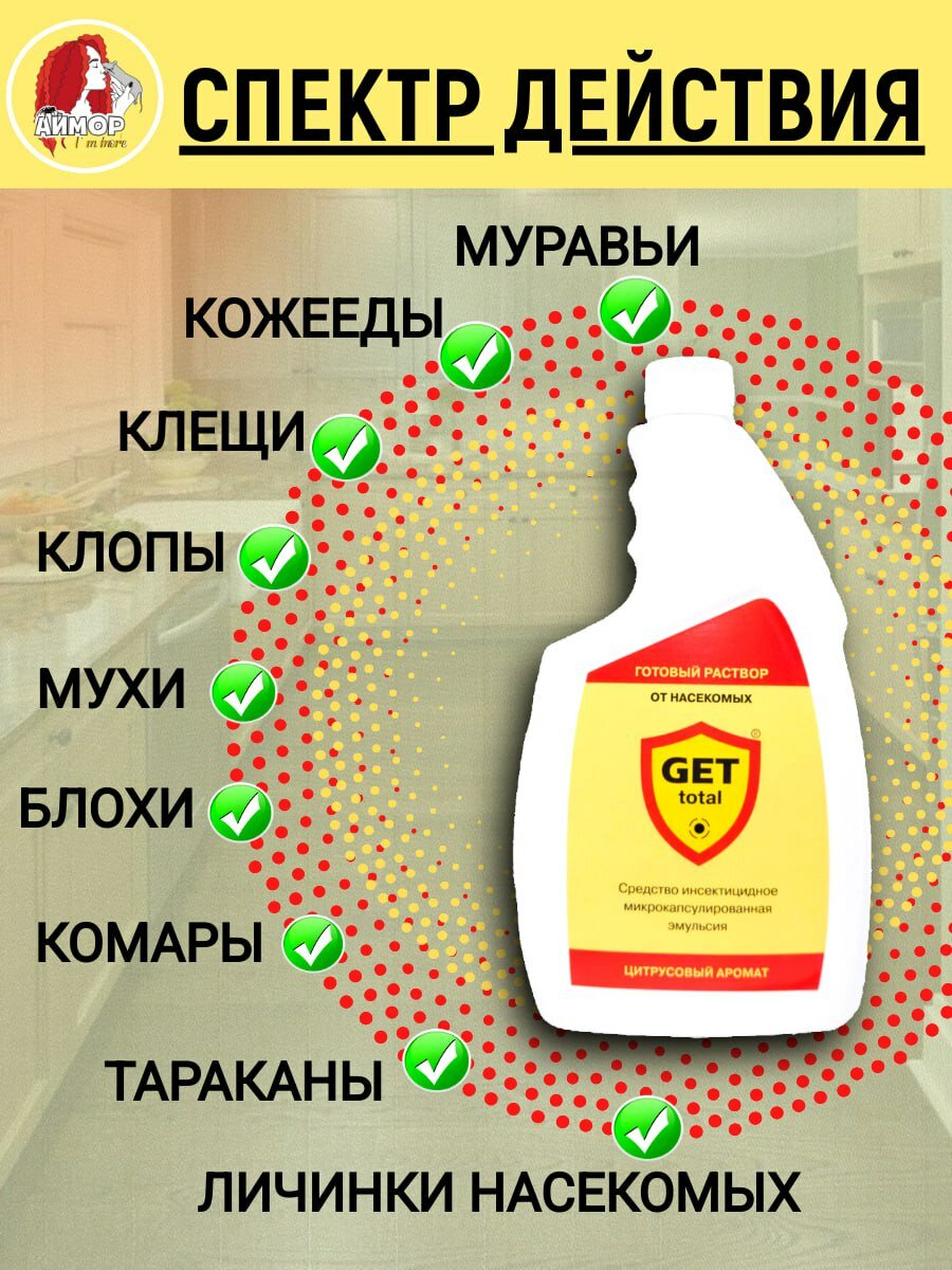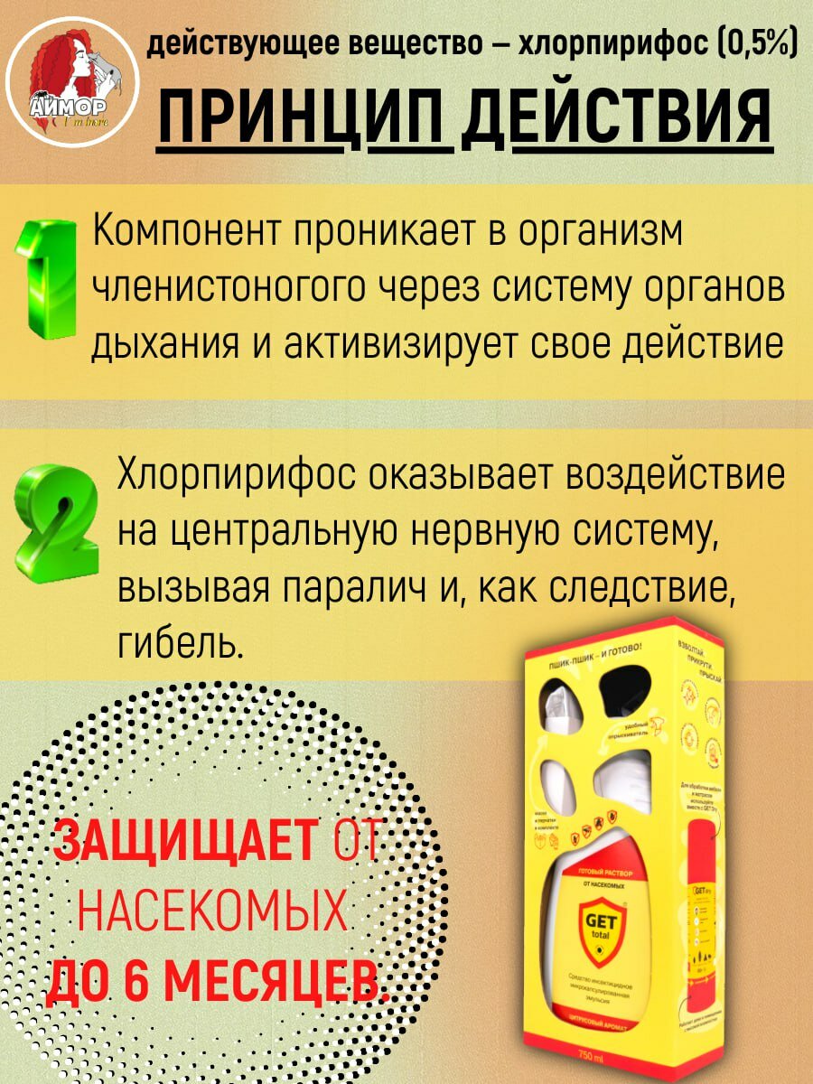 Почему выбирают GET Total готовый раствор Уничтожает, а не отпугивает. Защищает от насекомых до 6 месяцев. GET Total безопасен для людей, кошек, собак и других теплокровных. Его класс опасности после высыхания такой же, как у поваренной соли. Подтверждено сертификатом соответствия от Роспотребназдора. Имеет нейтральный запах и не оставляет следов. Легко применять дома: есть понятная инструкция, а средство заранее разведено с водой - просто бери и прыскай.