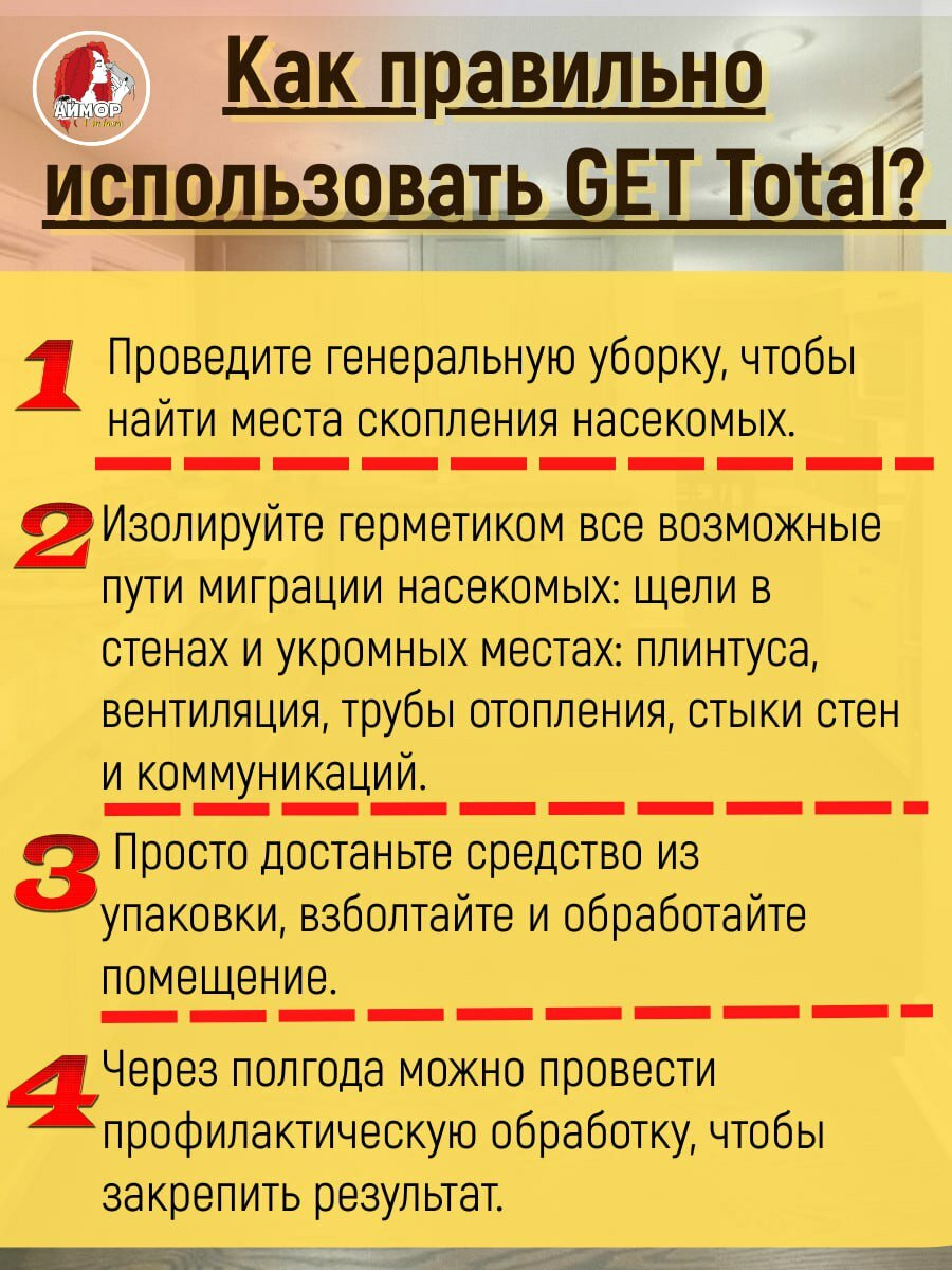 Эффект от GET Total проявляется не моментально, а в течение 14 дней: срок борьбы зависит от количества насекомых и качества обработки. На 3-5 день после обработки насекомые могут стать активнее, и может показаться, что их стало больше — это значит, что средство подействовало и через пару дней они погибнут.