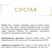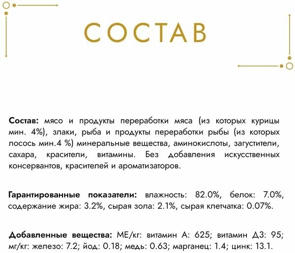 1. **Состав**: Корм содержит кусочки лосося и цыплёнка, что обеспечивает разнообразие вкусов и питательных веществ. Обычно в составе также присутствуют овощи и добавленные витамины.