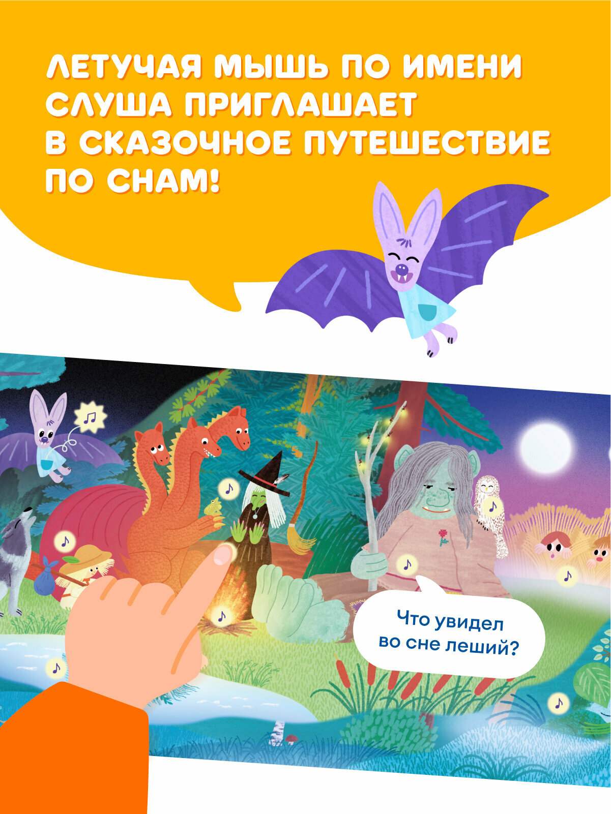 Вместе с летучей мышью Слушей малыш исследует красочные иллюстрации, услышит звуки природы, голоса животных, переливы музыкальных инструментов.