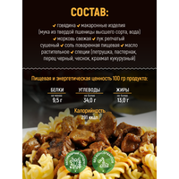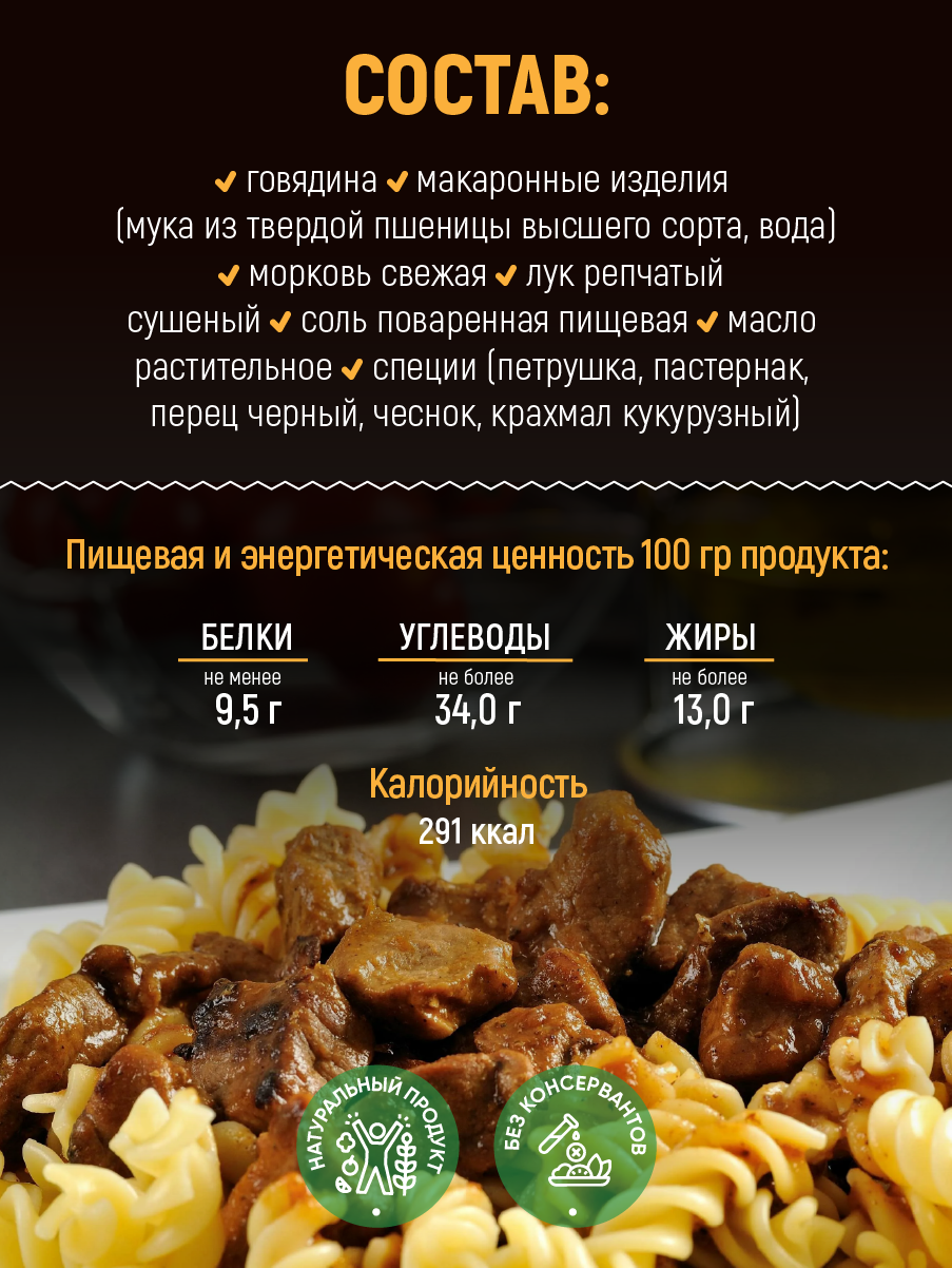 | Состав | говядина (не менее 37%), макаронные изделия(мука из твердой пшеницы высшего сорта, вода), морковь свежая, лук репчатый сушеный, соль поваренная пищевая, масло растительное, специи. |
