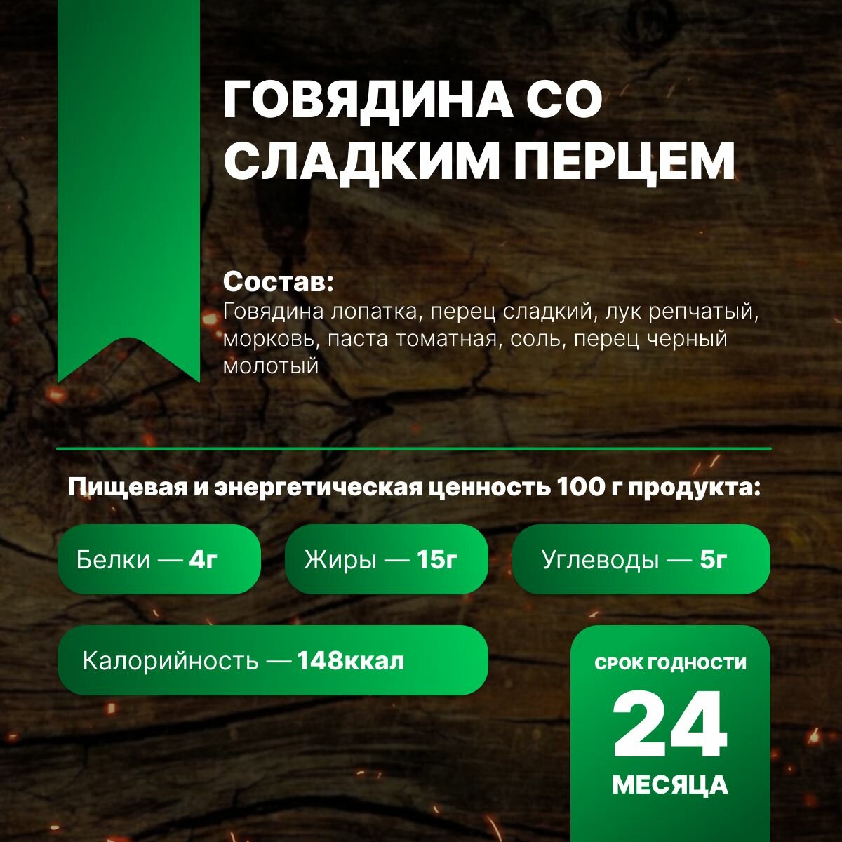 | Состав | говядина лопатка, перец сладкий замороженный, лук репчатый свежий, морковь свежая, паста томатная, соль поваренная пищевая, перец черный молотый |