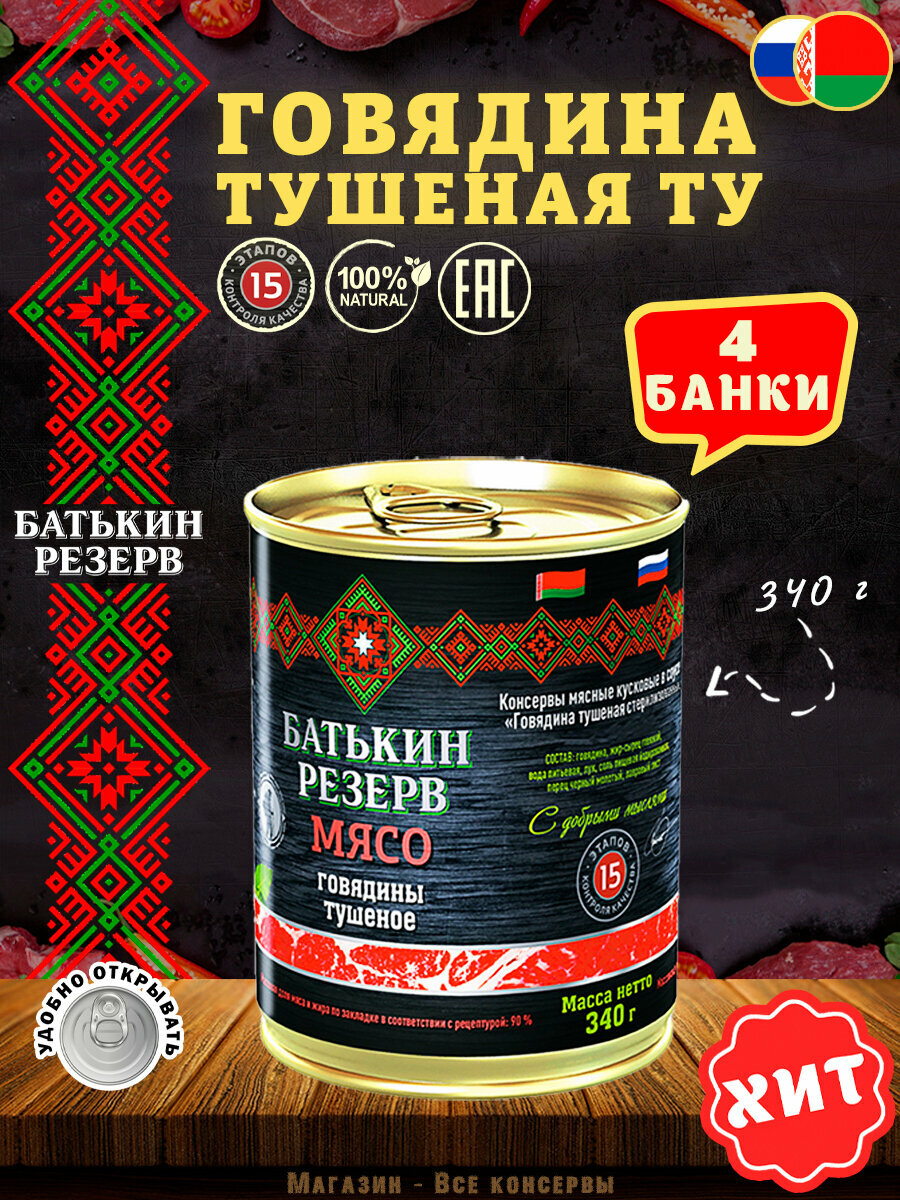 Говядина тушеная, Батькин резерв, ТУ, Белорусская, 4 шт. по 340 г: сравнение цен, характеристики, фото, актуальное наличие и цены.