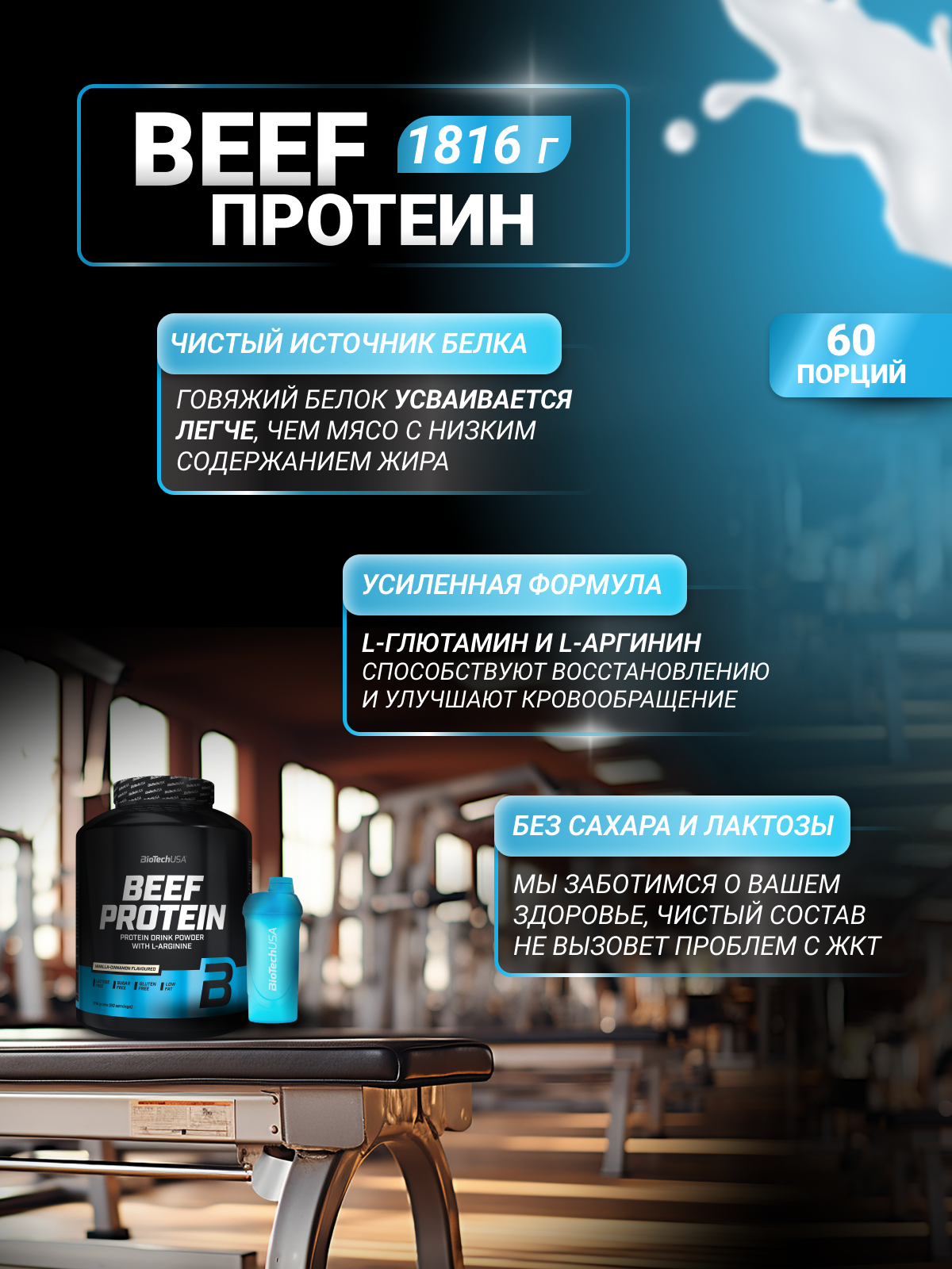 | Дополнительная информация | состав указан для вкуса "шоколад-кокос"; для вкуса "клубника-банан": гидролизованный говяжьего протеина (89,5%), мальтодекстрин, витаминный премикс (L-аскорбиновая кислота, никотинамид, DL-альфа-токоферола ацетат, гидрохлорид пиридоксина, рибофлавина, тиамина мононитрат, pteroylmonoglutamic кислота, D-биотин, бета-каротин, цианокобаламин), загуститель (натрий карбоксиметилцеллюлоза), клубники, банановый вкус, подсластитель (сукралоза), L-аргинин, L-глутамин, цвет (кошениль), L-лейцин, бромелайн фермента (1200 ГДУ), инулин, L-валин, L-изолейцин; для вкуса "ваниль-корица": гидролизованный белок из говядины (89,5%), мальтодекстрин, витаминный премикс (L-аскорбиновая кислота, никотинамид, DL-альфа-токоферол ацетат, пиридоксин гидрохлорид, рибофлавин, тиамин мононитрат, pteroylmonoglutamic кислота, D-биотин, бета-каротин, цианокобаламин), загуститель (натрий карбоксиметилцеллюлоза), ароматизатор ванильный, корица, подсластитель (сукралоза), L-аргинин, L-глутамин, L лейцин, бромелайн фермента (1200 ГДУ), инулин, L-валин, L-изолейцин; рекомендации по применению: Смешайте порцию Beef Protein с 250-350 мл воды.При взбалтывании протеин может вспениться.Принимайте 2-3 раза в день.; состав: гидролизованный говяжьего протеина (87,5%), какао-порошок, мальтодекстрин, витаминный премикс (L-аскорбиновая кислота, никотинамид, DL-альфа-токоферола ацетат, гидрохлорид пиридоксина, рибофлавина, тиамина мононитрат, pteroylmonoglutamic кислота, D-биотин, бета-каротин, цианокобаламин), загуститель (натрий карбоксиметилцеллюлоза), шоколадный вкус, аромат кокосового, подсластитель (сукралоза), L-аргинин, L-глутамин, цвет (обычный карамели), L-лейцин, бромелайн фермента (1200 ГДУ), инулин, L-валин, L-изолейцин |