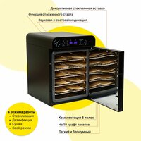 | Дополнительная информация | 3 полки вместимостью 6 крафт-пакетов 100х200 мм; полезный внутренний объем камеры стерилизации 5 литров; рабочее напряжение 220 В; частота 50 Гц; потребляемая электрическая мощность 0,6 кВт; средняя наработка времени на отказ не менее 1000 часов; средний срок службы не менее 5 лет |