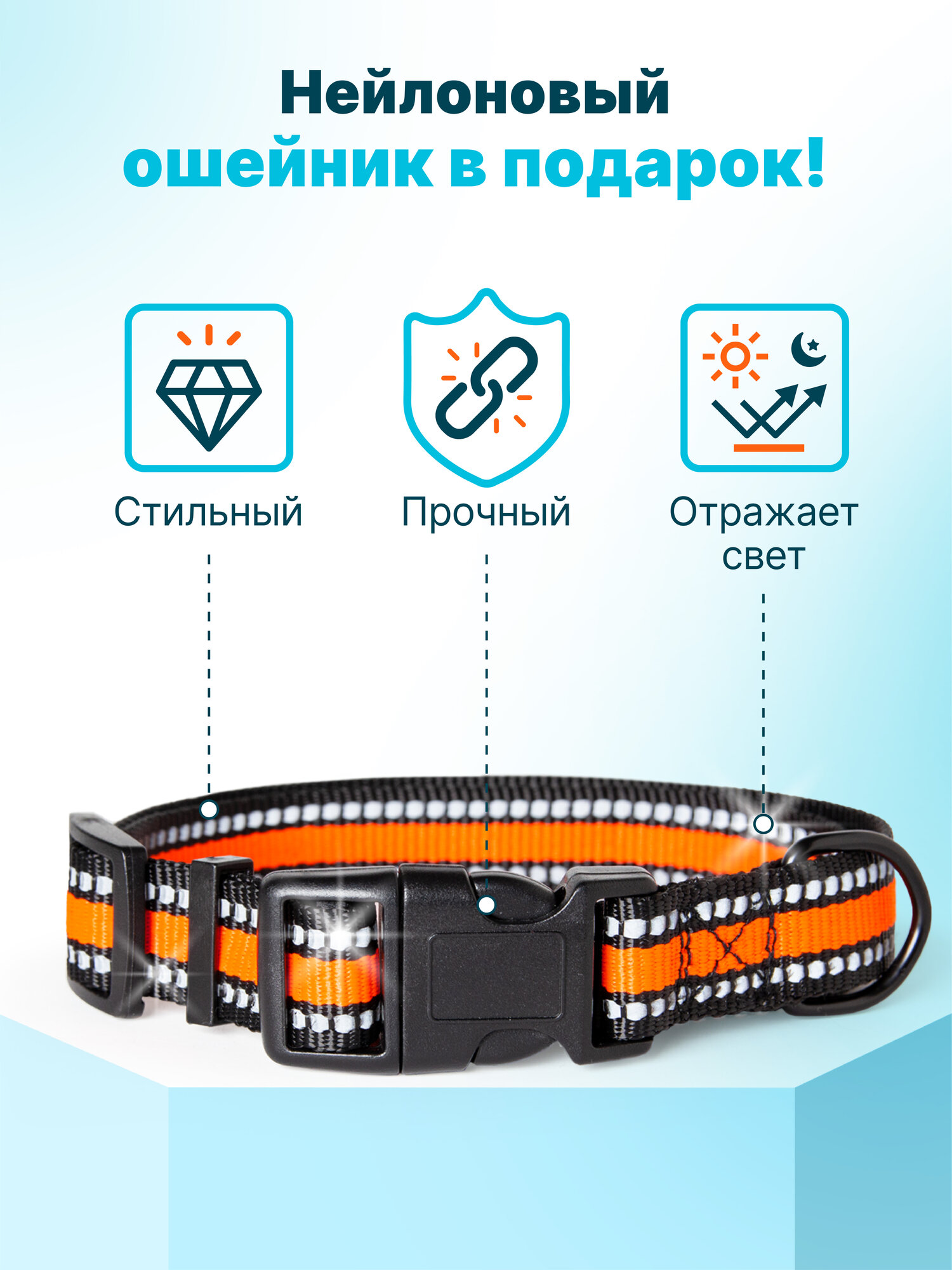 В комплект входит: трекер с установленной сим-картой, регулируемый ошейник, зарядный кабель, инструкция.