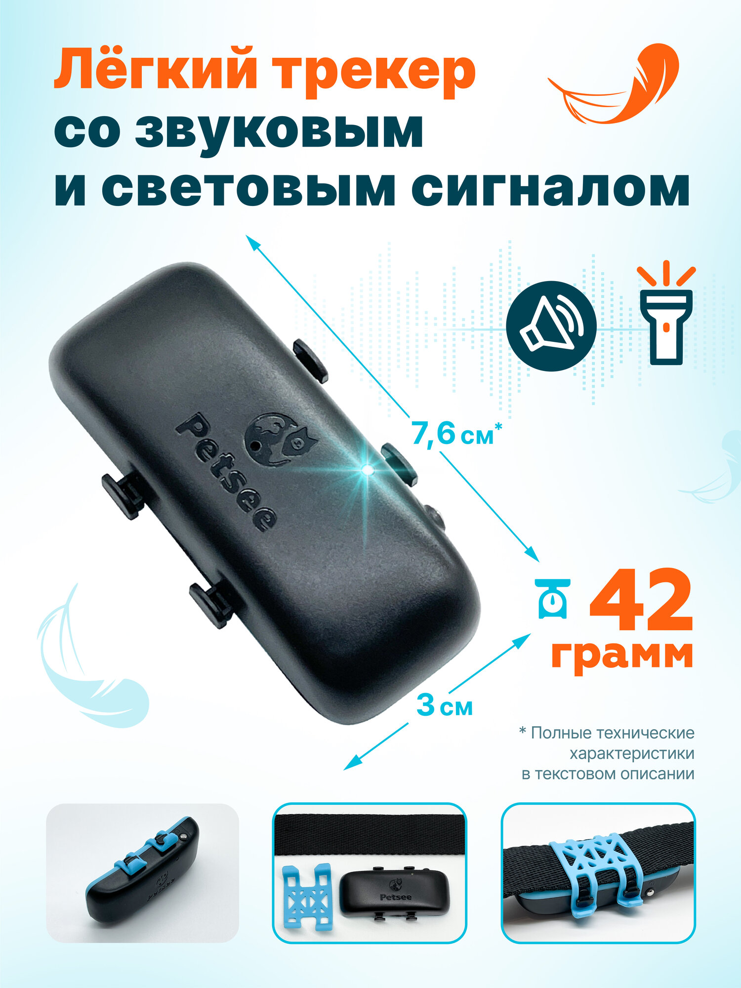 Вес GPS трекера для собак 42 грамма, можно прикрепить на любой свой ошейник, шириной до 3 см. Ошейник в комплект трекера не входит.