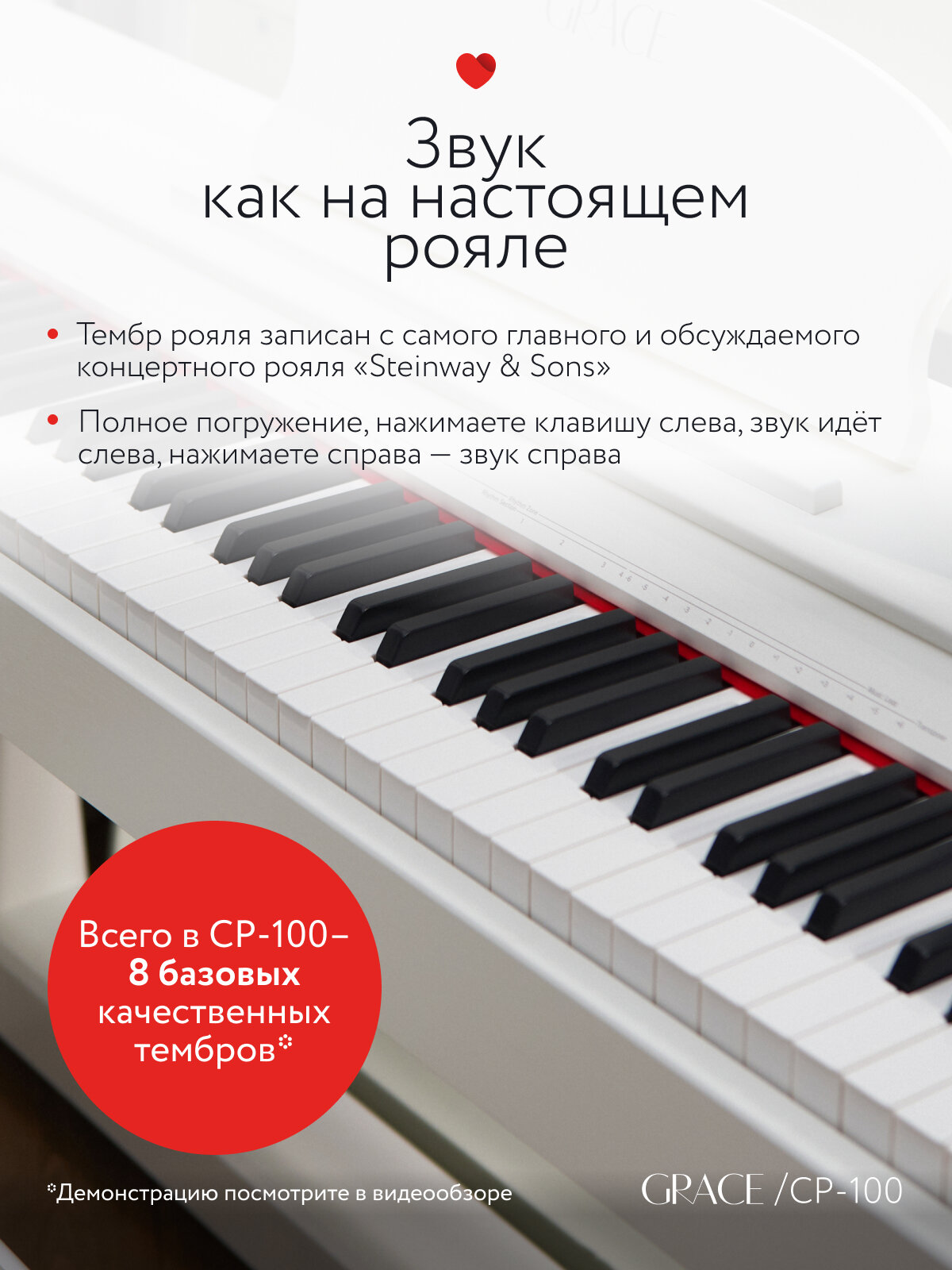Grace CP-100 — это сочетание качества, функциональности и доступности, которое подойдет как начинающим, так и опытным музыкантам. Начните играть и творить с цифровым пианино, которому доверяют тысячи!