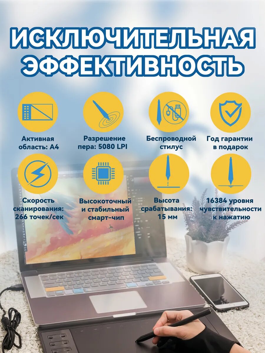 | Подробная комплектация | графический планшет*1,Type-C Адаптер*1,Micro-USB Адаптер*1,перчатки*1,держатель ручки*1, сменных стержней*10,руководство по эксплуатации*1 |
