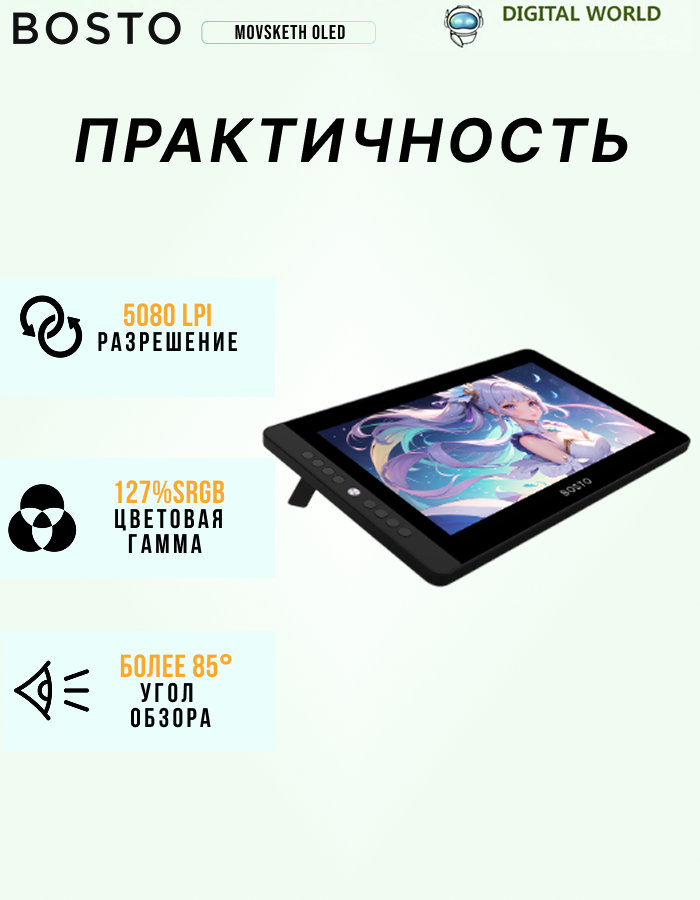 Графический планшет BOSTO Movsketh, Oled, диагональ 13″, интерфейсы mini-HDMI, Type-C