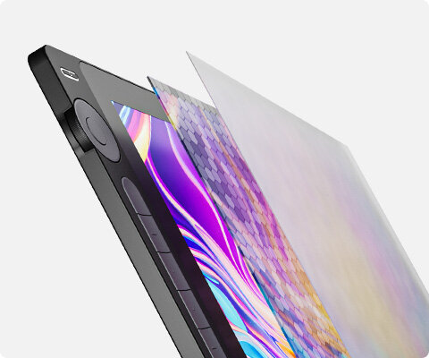 Эргономичный дизайн регуляторов: Небольшой выступ и лёгкое вращение — регулятор выступает всего на 2 мм от края экрана, что позволяет легко находить его кончиками пальцев и плавно вращать для точной настройки параметров кисти, полотна или кадров. Этот продуманный дизайн одинаково удобен для левшей и правшей.