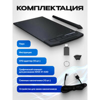 графический планшет Xenx X1-640; цифровое перо (пассивное); кабель Micro USB для подключения планшета к компьютеру/ноутбуку/смартфону; OTG адаптер (для USB-C разъемов); 10 запасных наконечников для цифрового пера; кольцо-пинцет для замены наконечников; инструкция пользователя