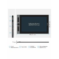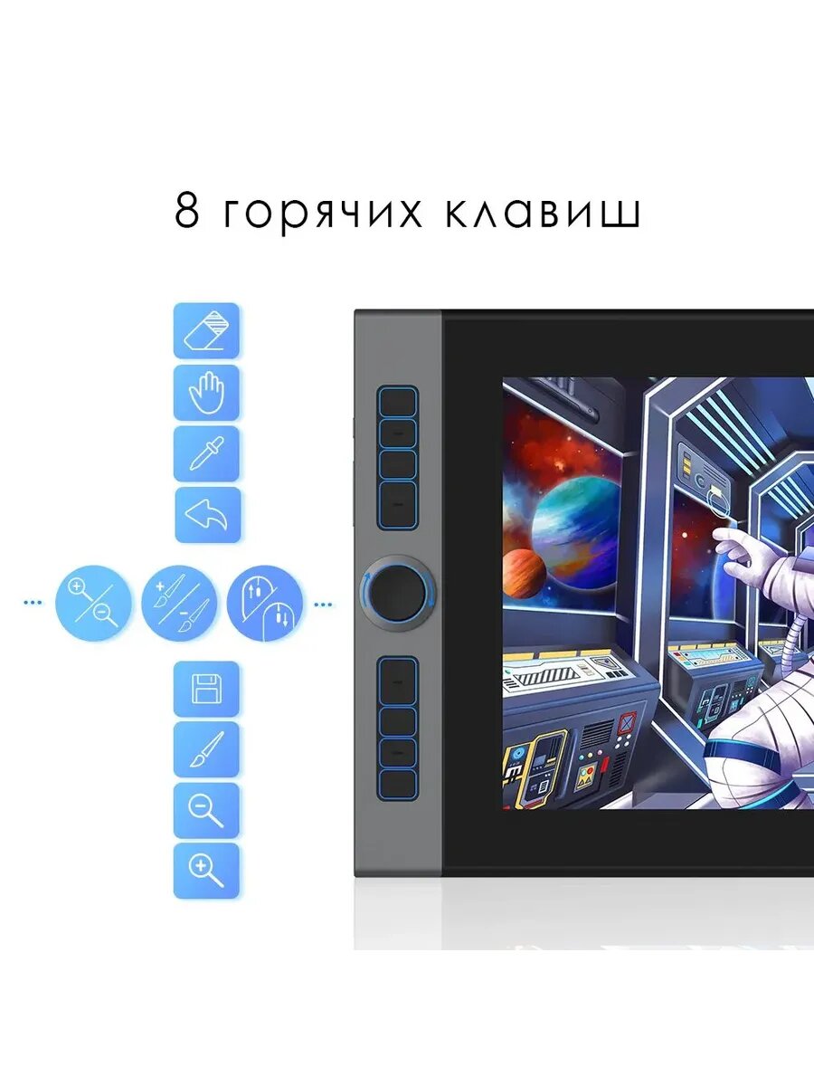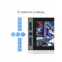 Интерактивный дисплей оснащен двумя колесами управления: механическим и виртуальным (тачпад), которые позволяют увеличивать/уменьшать масштаб холста, регулировать размер кисти и другое. 8 горячих клавиш, благодаря возможности их программирования, помогут оптимизировать рабочий процесс.