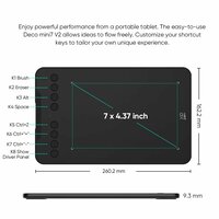 Ультрапортативный планшет поддерживает 16 ,384 уровней чувствительности к давлению, поэтому вы можете наслаждаться мощью производительности с доступным Deco mini7 V2, вы можете черпать вдохновение, куда бы вы ни пошли, и сохранять свой творческий потенциал на ходу.