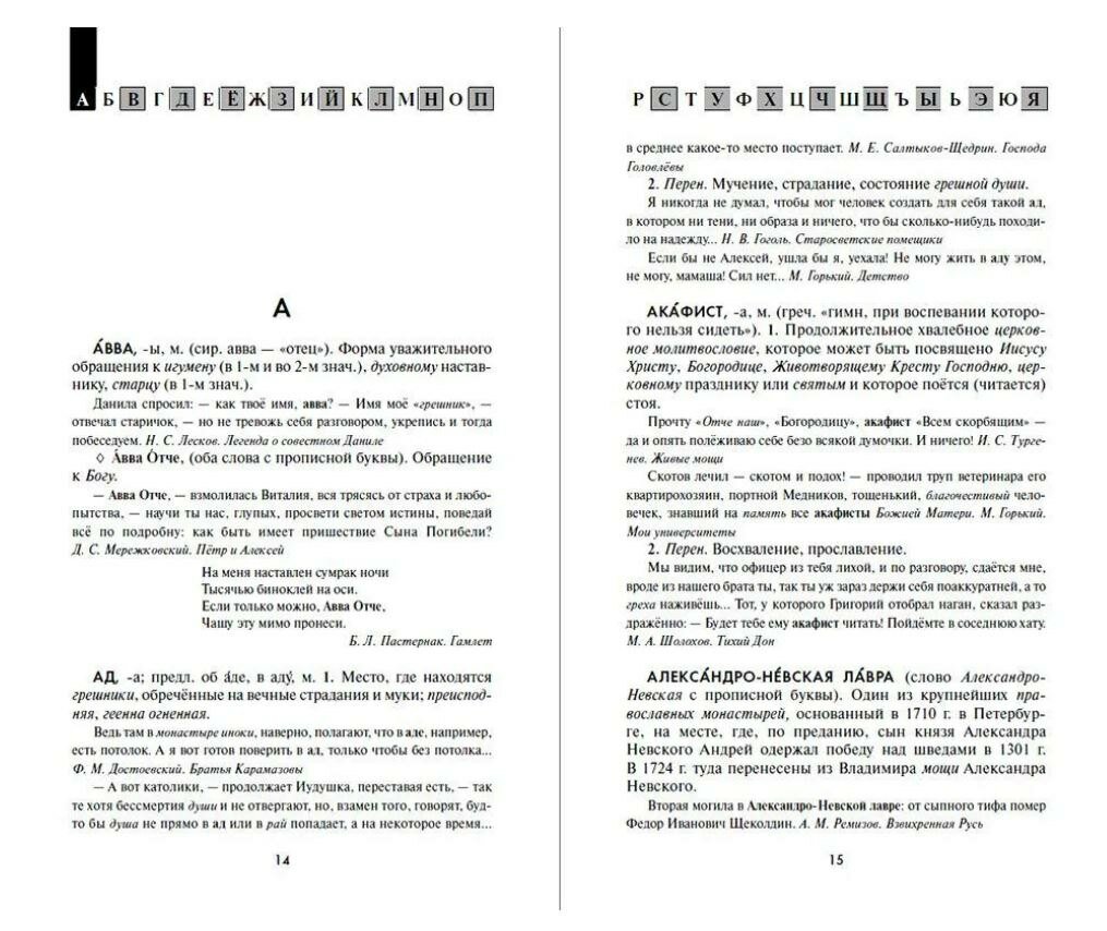В словарь включено более 1000 слов церковно-богослужебного обихода, словарные статьи снабжены толкованием слов, интересными сведениями, а также примерами из произведений русской литературы XIX–XX вв.