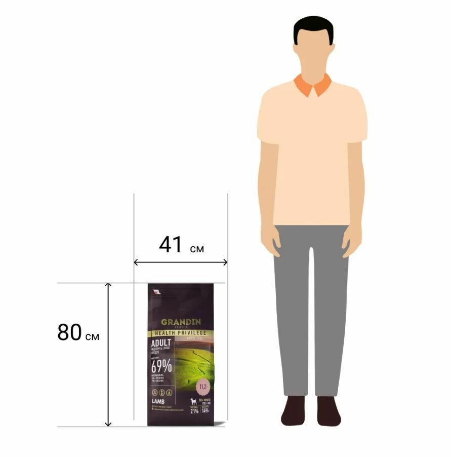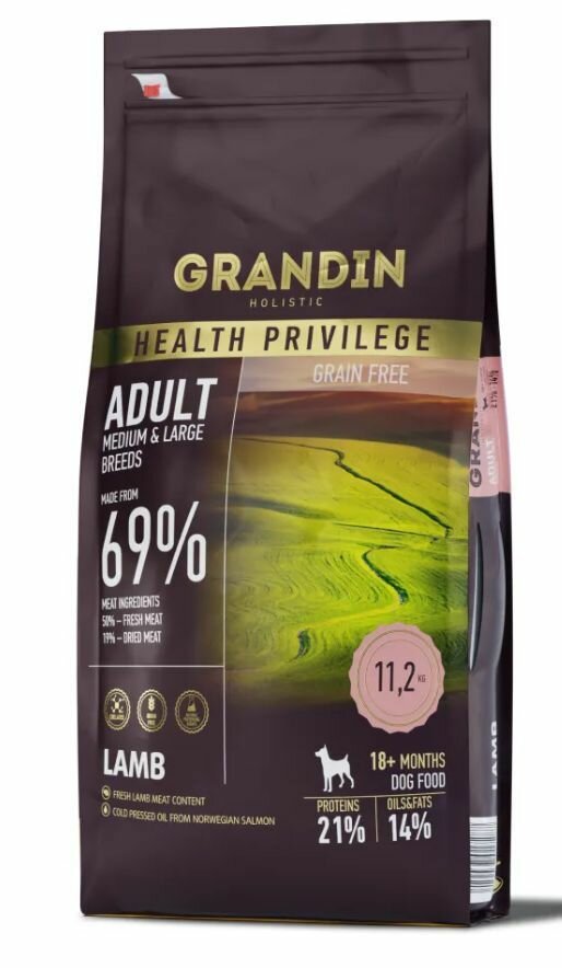 GRANDIN Adult Medium & Large Breeds Lamb – холистик корм для взрослых собак средних и крупных пород, с ягненком. Новая улучшенная формула питания: свежая ягнятина с на ломтиках тыквы с ягодами клюквы понравится вашему питомцу! Преимущества: Формула здорового питания: Ягненок – богатый источник витаминов группы В, ответственных за обновление клеток. Содержит цинк, который укрепляет иммунную систему. Тыква – эффективно поддерживает пищеварение и обеспечивает нормальное функционирование пищеварительной системы. Люцерна – нормализует пищеварение, очищает почки, способствует обновлению клеток. Черная смородина– замедляет процессы старения, усиливает иммунную систему, улучшает эластичность сосудов. Чертополох молочный - антиоксидант, стимулирует регенерацию клеток печени, выводит токсины. Шиповник – богатый источник витамина С, обеспечивает здоровое функционирование мочеполового тракта и почек, усиливает иммунную систему. Срок годности: 18 месяцев с даты изготовления. Мясо (50% свежее мясо ягнёнка, 16% высушенное мясо ягнёнка, 3% печень ягнёнка), фермерский картофель, горошек, свекольная пульпа, пивные дрожжи, яблоки, семена льна, масло холодного отжима из норвежского лосося (обработанное токоферолами), травяной комплекс (эхинацея, листья одуванчика, цветки ромашки и липы сердцевидной), люцерна, тыква, клюква, корень цикория, подорожник, сушёные морские водоросли (Ascophyllum nodosum), глюкозамин, хондроитина сульфат, юкка, гарпагофитум, комплекс природных антиоксидантов. Анализ состава; Сырой протеин21% Сырой жир14% Сырая клетчатка3% Сырая зола6,9% Влага8% Кальций1,55% Фосфор0,95% Пищевые добавки на 1 кг продукта; Витамин А17100 МЕ Витамин D31305 МЕ Витамин E40 мг Витамин С100 мг Медь (хелат меди (II) из гидрата аминокислоты)5 мг Марганец (марганца (II) оксид)54 мг Цинк (оксид цинка)110 мг Железо (железистый сульфат (II), моногидрат)40 мг Цинк (гидрат хелата цинка и аминокислот)10 мг Йод (йодид калия)4 мг Селен (селенит натрия)0,3 мг Содержит натуральные антиоксиданты. Энергетическая ценность: 380 ккал / 100 г